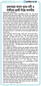 মুক্তাগাছার আসাদ খুরে ঘটনায় ৩০ জন আসামী করা হয়। এ সকল আসামীদের মধ্যে জামাত ও বিএনপি’র লোক রয়েছে। এরা এখন মামলাটি প্রত্যাহার করাতে মামলার বাদী ও স্বাক্ষীদের খুন করার হুমকী দিচ্ছে। যার মামলা নং ৩০(৮)২০২৩। মামলার প্রধান অভিযুক্ত মনি বাচাঁতে থানা পুলিশ আলামত নষ্ট করে। খুনে ব্যবহরিত অস্রগুলো উদ্ধারের স্থান ও কার হেফজত এবং কার দখলিয় ঘর থেকে উদ্ধার করে তার বর্ননা ভিন্ন আকারে লিপিবদ্ধ করে। এছাড়াও ধৃত আসামীদের দিয়ে শিখানো জবানবন্দি দেয়ায় এবারও মনিকে বাদ দেয়ার চিন্তা ভাবনা করে পুলিশ। এমন অভিযোগ স্থানীয়দের। মামলাটি বর্তমানে জেলা গোয়েন্দা সংস্থা তদন্তে নেমেছে। আর তখন থেকেই স্বাক্ষী ও বাদীকে মামলা প্রত্যাহার করার জন্য হুমকী দিচ্ছে খুনি চক্র।