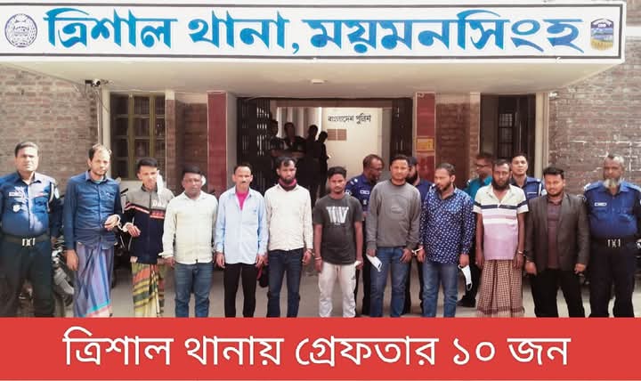 ময়মনসিংহের ত্রিশালে থানা পুলিশ বিশেষ অভিযান পরিচালনা করে ১০ জনকে গ্রেফতার করেছে। সোমবার সকাল পর্যন্ত গত ২৪ ঘন্টায় বিভিন্ন এলাকা থেকে তাদেরকে গ্রেফতার করা হয়েছে।