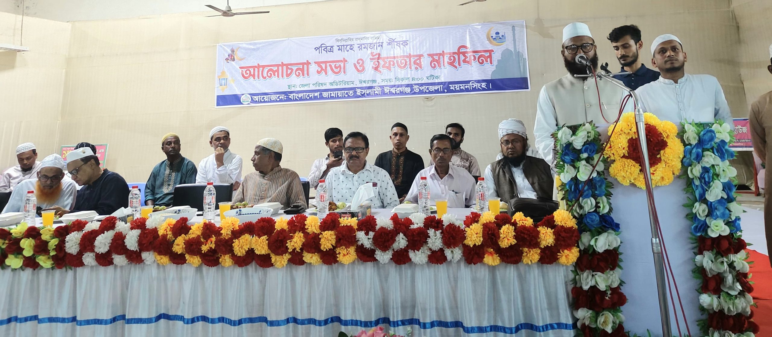 আলোচনাসভা ও ইফতার মাহফিলে বাংলাদেশ জামায়াতে ইসলামী ঈশ্বরগঞ্জ উপজেলা শাখার প্রচার ও মিডিয়া সম্পাদক এইচএম মাজহারুল ইসলামের সঞ্চলনায় বক্তব্য দেন-জামায়াতে ইসলামী উপজেলা শাখার সাধারণ সম্পাদক আবুল খায়ের মোহাম্মদ বারাকাতুল্লাহ, উপজেলা বিএনপির আহ্বায়ক প্রকৌশলী লুৎফুল্লাহেল মাজেদ বাবু, উপজেলা বিএনপির সম্মানিত সদস্য ও সাবেক সংসদ সদস্য আলহাজ্ব শাহ নুরুল কবীর শাহীন, উপজেলা বিএনপির সদস্য সচিব আমিরুল ইসলাম ভূঁইয়া মনি, যুগ্ম-আহ্বায়ক আতিকুর রাজ্জাক ভূঁইয়া হীরা, একেএম হারুন অর রশিদ, জামায়াতে ইসলামী ঈশ্বরগঞ্জ উপজেলা শাখার সহ-সাধারণ সম্পাদক অধ্যক্ষ তানহার আলী,