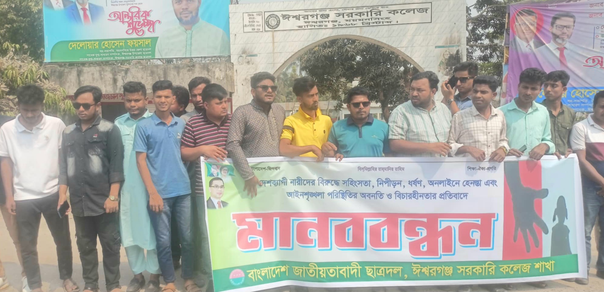 ময়মনসিংহের ঈশ্বরগঞ্জ সরকারি কলেজ শাখা ছাত্রদলের পক্ষে দেশব্যাপী চলমান নারী ধর্ষণ, নিপীড়ন ও নির্যাতনের প্রতিবাদে মানববন্ধন কর্মসূচি পালন করা হয়েছে।