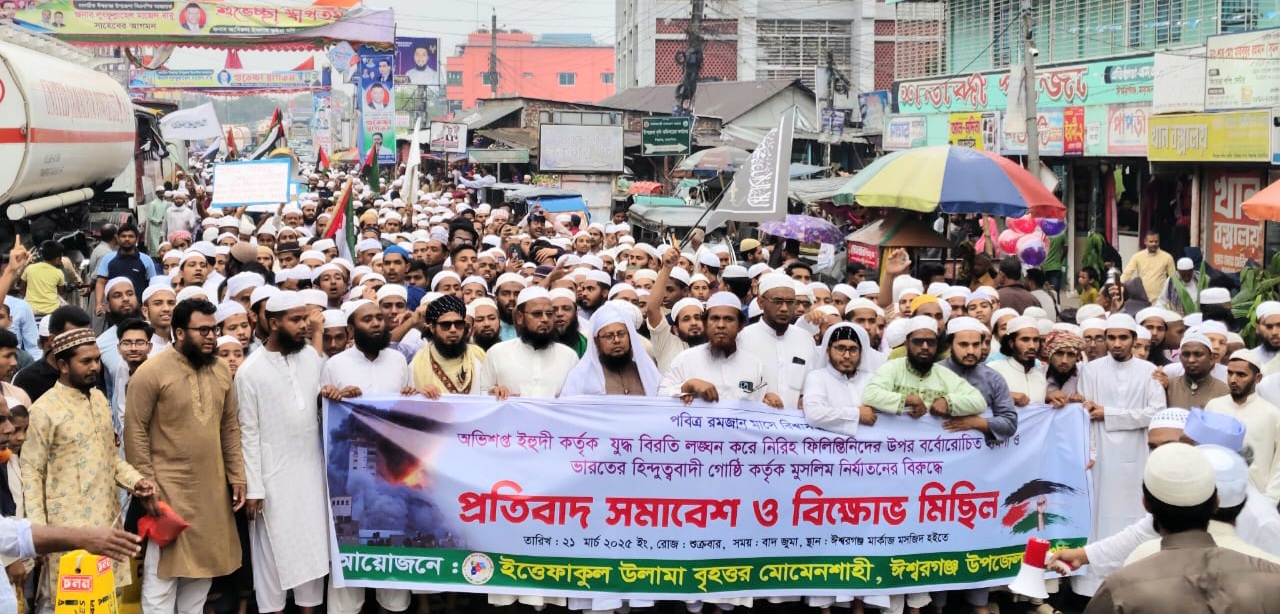 শুক্রবার জুমার নামাজ শেষে উপজেলার মার্কাজ মসজিদ থেকে এ মিছিল শুরু হয়। এ সময় বিভিন্ন শ্লোগান সম্বলিত ব্যানার, ফেস্টুন ও গাজার পতাকা হাতে নিয়ে মিছিলে অংশ নিতে দেখা যায় মুসল্লিদের। মিছিলটি ঈশ্বরগঞ্জ মার্কাজ মসজিদের সামনে থেকে বের হয়ে শহরের বিভিন্ন সড়ক পদক্ষিণ শেষে উপজেলা পরিষদের সামনে গিয়ে প্রতিবাদ সমাবেশের মধ্যে দিয়ে শেষ হয়।