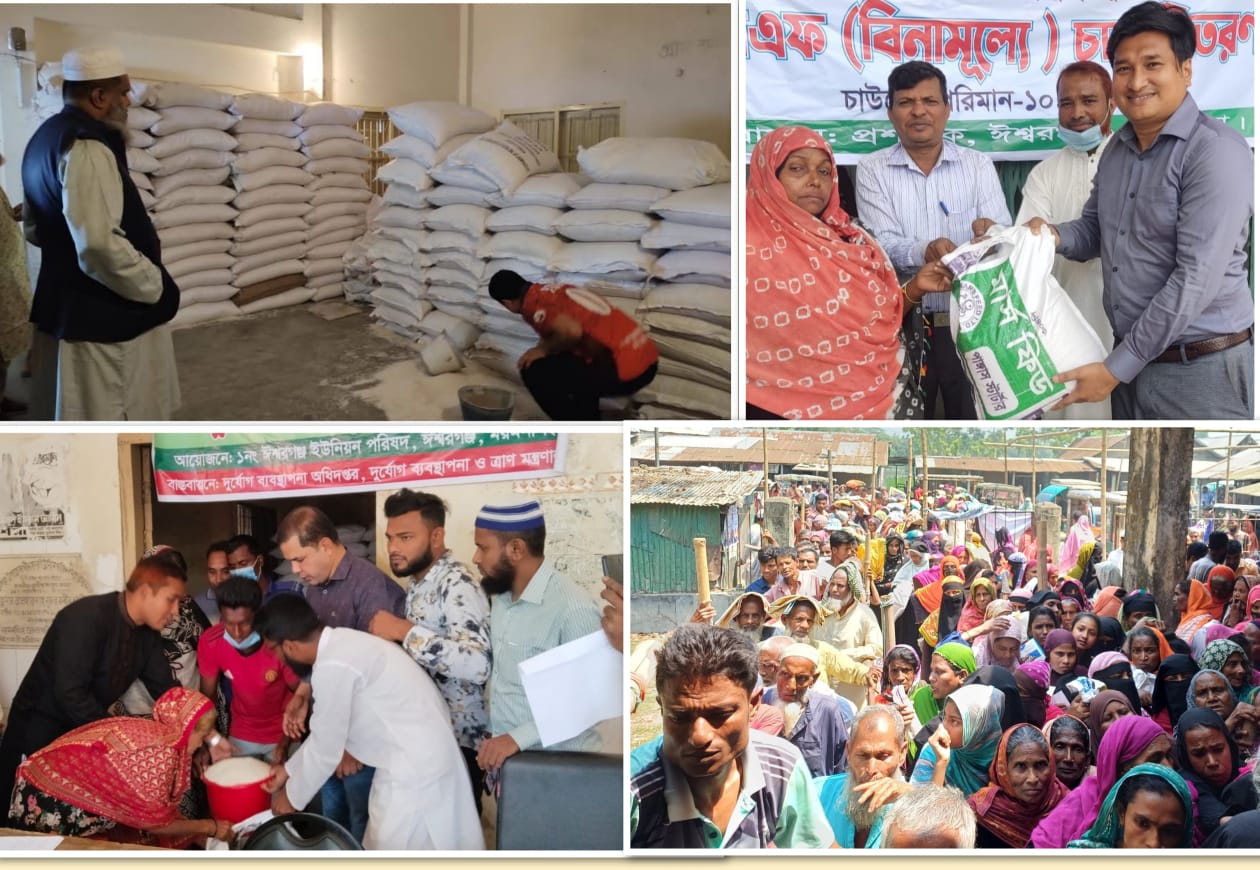 একটি 'ক' শ্রেণির পৌরসভা ও ১১টি ইউনিয়ন নিয়ে ময়মনসিংহের ঈশ্বরগঞ্জ উপজেলা। মুসলিম সম্প্রদায়ের সবচেয়ে বড় ধর্মীয় উৎসব পবিত্র ঈদু-ফিতর উপলক্ষে ঈশ্বরগঞ্জ পৌরসভার ৯টি ওয়ার্ডে ৪,৬২১টি এবং উপজেলার ১১ ইউনিয়নের ২৮৮৫৪ টি দরিদ্র, অসহায় ও দুস্থ পরিবারের মাঝে বিনামূল্যে ভিজিএফ খাদ্যশস্য (চাল) বিতরণ করা হয়েছে।