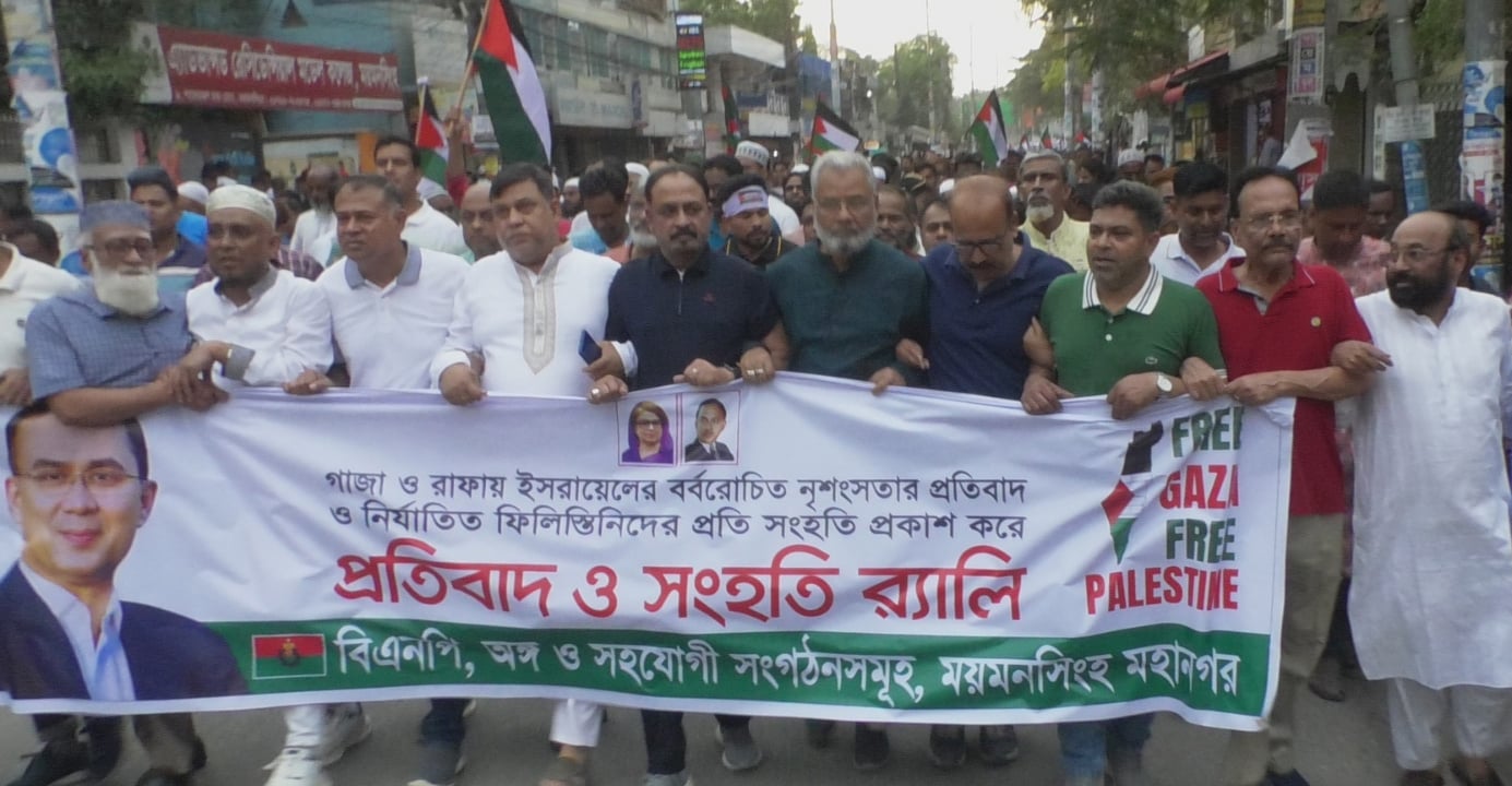 ফিলিস্তিনের গাজায় ঈসরাইলের বর্বর হামলার প্রতিবাদে ময়মনসিংহ বিএনপির সংহতি র্যালীতে জনতার ঢল নেমেছে। এ সময় ‘নায়ারে তাকবির, আল্লাহু আকবার’ শ্লোগানে প্রকম্পিত হয়ে উঠে পুরো নগরী। বৃহস্পতিবার (১০ এপ্রিল) সন্ধ্যা সাড়ে ৫টার দিকে ময়মনসিংহ নগরীর টাউন হল চত্বরে এই সংহতি র্যালী বের হয়ে নতুন বাজার, গাঙ্গিনাপাড় ও স্টেশন রোড এলাকা প্রতিক্ষণ করে। এর আগে টাউন হল মোড়ে ময়মনসিংহ উত্তর, দক্ষিণ ও মহানগর বিএনপির যৌথ আয়োজনে ফিলিস্তিনের গাজায় ঈসরাইলের বর্বর হামলার প্রতিবাদে এই সংহতি র্যালীর পূর্বে সংক্ষিপ্ত সমাবেশ করে বিএনপি। এতে প্রধান অতিথির বক্তব্য রাখেন বিএনপির জাতীয় নির্বাহী কমিটির সহসাংগঠনিক সম্পাদক শাহ ওয়ারেস আলী মামুন। এ সময় প্রধান বক্তা হিসাবে বক্তব্য রাখেন বিএনপির জাতীয় নির্বাহী কমিটির আরেক সহসাংগঠনিক সম্পাদক আবু ওয়াহাব আকন্দ ওয়াহিদ। সমাবেশে মহানগর বিএনপির আহবায়ক অধ্যাপক একেএম শফিকুল ইসলামের সভাপতিত্বে আরও উপস্থিত ছিলেন উত্তর জেলা বিএনপির আহবায়ক এনায়েত উল্লাহ কালাম, যুগ্ম আহবায়ক মোতাহার হোসেন তালুকদার, দক্ষিণ জেলা বিএনপির যুগ্ম আহায়ক আলমগীর মাহমুদ আলম, মহানগর বিএনপির যুগ্ম আহবায়ক অধ্যাপক শেখ আহজাদ আলী, কাজী রানা, ফারজানা রহমান হুসনা, শামীম আজাদ, একেএম মাহাবুবুল আলম, শাহ শিব্বির আহম্মেদ ভুলুসহ বিএনপি ও অঙ্গ সংগঠনের র্শীষ নেতৃবৃন্দ।