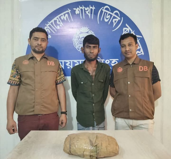 অফিসার ইনচার্জ, জেলা গোয়েন্দা শাখা, ময়মনসিংহের নির্দেশে এসআই(নিঃ) মোঃ তোয়াবুল ইসলাম খান সংগীয় অফিসার ও ফোর্সসহ অভিযান পরিচালনা করে ময়মনসিংহ জেলার হালুয়াঘাট থানাধীন ধারা বাজার বাসষ্ট্যান্ড জামে মসজিদ সংলগ্ন বিসমিল্লাহ ষ্টোরের সামনে হইতে ১৮ এপ্রিল ২০২৫ খ্রিঃ তারিখ ২০.২০ ঘটিকায় ০২ কেজি গাঁজাসহ আসামী মোঃ আজিজুল ইসলাম @ ঝন্টু (৪৬), পিতা-ওসমান আলী, মাতা-আমেনা, সাং-কুমুড়িয়া, থানা-হালুয়াঘাট, জেলা-ময়মনসিংহকে গ্রেফতার করা হয়। গ্রেফতারকৃত আসামী দীর্ঘদিন যাবৎ মাদক কারবারির সাথে জড়িত এবং এই চক্রের সাথে জড়িত অন্যান্যদের সনাক্ত ও গ্রেফতারের অভিযান অব্যাহত।