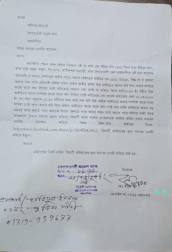 জিডির সঙ্গে ভুয়া ফেসবুক আইডির একটি লিংকও সংযুক্ত করেছেন ইদ্রিছ খান। ময়মনসিংহ কোতোয়ালী মডেল থানার ডিউটি অফিসার ২০ এপ্রিল তারিখে জিডিটি গ্রহণ করেন, যার নম্বর ১৮৭।