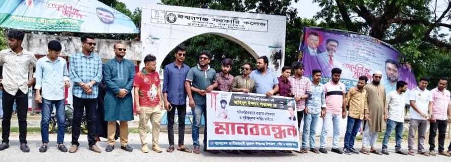 প্রাইম এশিয়া বেসরকারি বিশ্ববিদ্যালয়ের শিক্ষার্থী বাংলাদেশের জাতীয়তাবাদী ছাত্রদলের কর্মী জাহিদুল ইসলাম পারভেজ কে পরিকল্পিত ভাবে হত্যার প্রতিবাদে ও হত্যার সাথে জড়িতদের দৃষ্টান্তমূলক শাস্তির দাবি জানিয়ে মানববন্ধন করা হয়েছে। সোমবার বিকেলে উপজেলা, পৌর ও কলেজ শাখা ছাত্রদলের উদ্যোগে ঈশ্বরগঞ্জ সরকারি কলেজের সামনে ময়মনসিংহ-কিশোরগঞ্জ আঞ্চলিক মহাসড়কে ওই মানববন্ধন করা হয়।