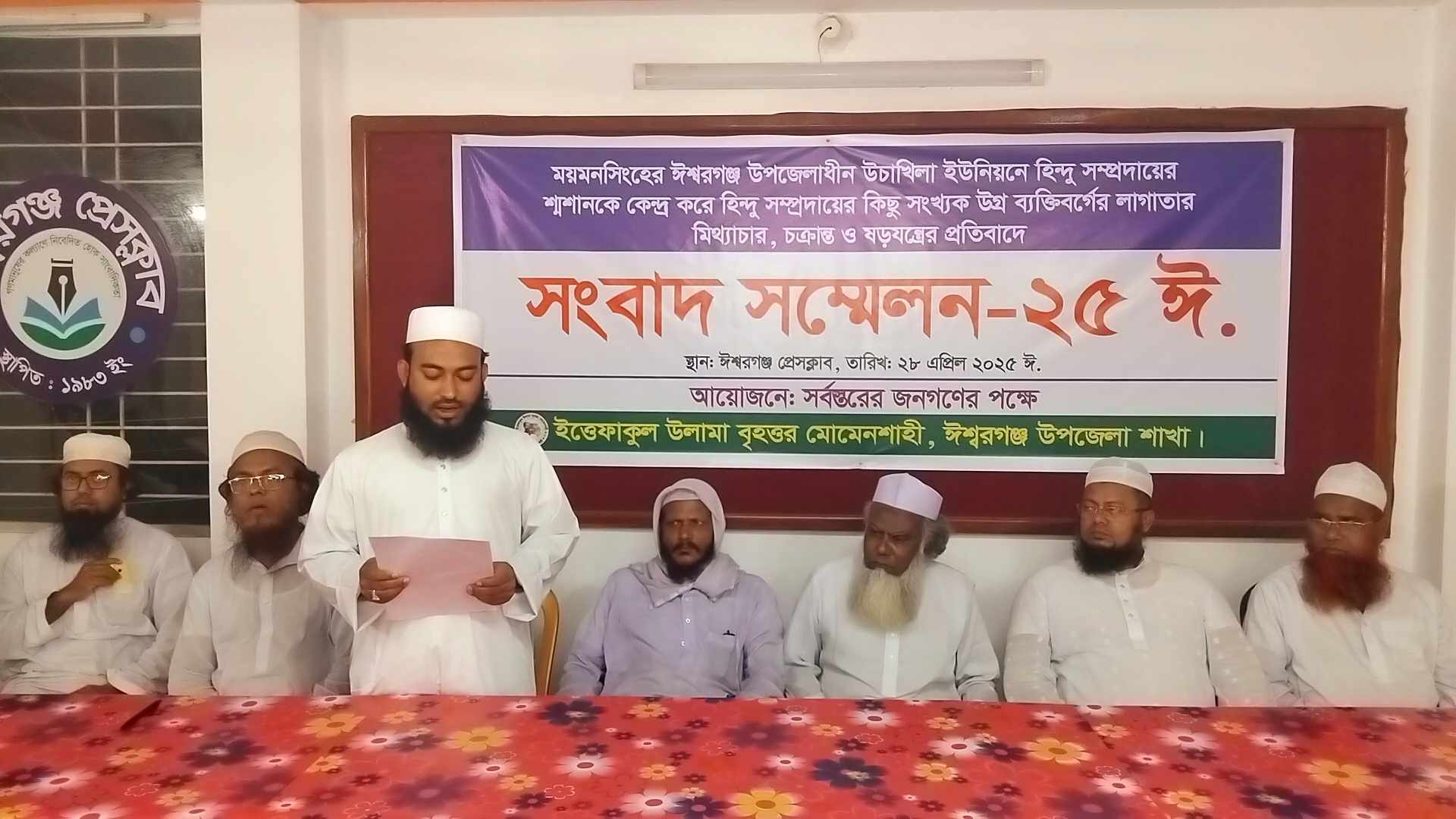 সংবাদ সম্মেলনের ইসলামি আন্দোলন ঈশ্বরগঞ্জ উপজেলা শাখার সভাপতি মুফতি হাবিবুল্লাহ বলেন, এই দেশে হিন্দু-মুসলিম একই ফুলের দুটি বৃত্তে বসবাস করে আসছে। কিন্তু সম্প্রতি সময়ে ময়মনসিংহের ঈশ্বরগঞ্জ উপজেলার উচাখিলা ইউনিয়নের শ্মশান নিয়ে হিন্দু সম্প্রদায়ের উগ্র কিছু ব্যক্তিবর্গ গত রবিবার মানববন্ধনের নামে ঈশ্বরগঞ্জ পৌর শহরে রাস্তা অবরোধ করে যে জনদুর্ভোগ তৈরি করে এটা কোনভাবেই কাম্য নয়। তারা বিভিন্ন রকম উস্কানিমূলক স্লোগান দিয়ে উপজেলা নির্বাহী অফিসারের পদত্যাগ দাবি করে যা শ্মশানে ভাংচুরের ঘটনার সাথে কোনভাবেই সামঞ্জস্যশীল নয়। এটি উদ্দেশ্যে প্রণোদিত ও রাজনৈতিক ষড়যন্ত্র বলে আমরা মনে করি। আমরা উলামায়ে কেরাম শ্মশান পরিদর্শন করে স্বচক্ষে দেখে ও শত শত স্থানীয় ব্যক্তিদের উপস্থিতিতে এর কোন সত্যতা পায়নি। উপজেলা নির্বাহী কর্মকর্তা গত ২৬ তারিখ দিবাগত রাতে হিন্দু নেতৃবৃন্দদের সাথে আলোচনা করে শ্মশানে মাটি ভরাট করে ক্ষতিগ্রস্ত পিলার উপজেলার অর্থায়নে নতুন করে স্থাপন করে দেওয়া হবে এমনকি নিচুতে থাকা শ্মশানের চিতা ও জীর্ণ-শীর্ণ মন্দির সংস্কার করে দিবে বলে আশ্বস্ত করেন। কিন্তু পরবর্তী দিনই হিন্দু সম্প্রদায়ের কিছু উগ্রপন্থী ব্যক্তিবর্গ মানববন্ধনে নামে সড়ক অবরোধ করে সাধারণ মানুষের জনদুর্ভোগ সৃষ্টি করে। যা সম্পূর্ণ উদ্দেশ্য প্রণোদিত ও ষড়যন্ত্রমূলক। আমরা সংবাদ সম্মেলনে মাধ্যমে এর তীব্র নিন্দা ও প্রতিবাদ জানাচ্ছি। বিষয়টি নিয়ে সুষ্ঠু তদন্তের মাধ্যমে মিথ্যাচার ও ধর্মীয় সম্প্রীতি বিনষ্টকারীদের চিহ্নিত করে দ্রুত আইনের আওতায় এনে দৃষ্টান্তমূলক শাস্তি দাবী করছি।