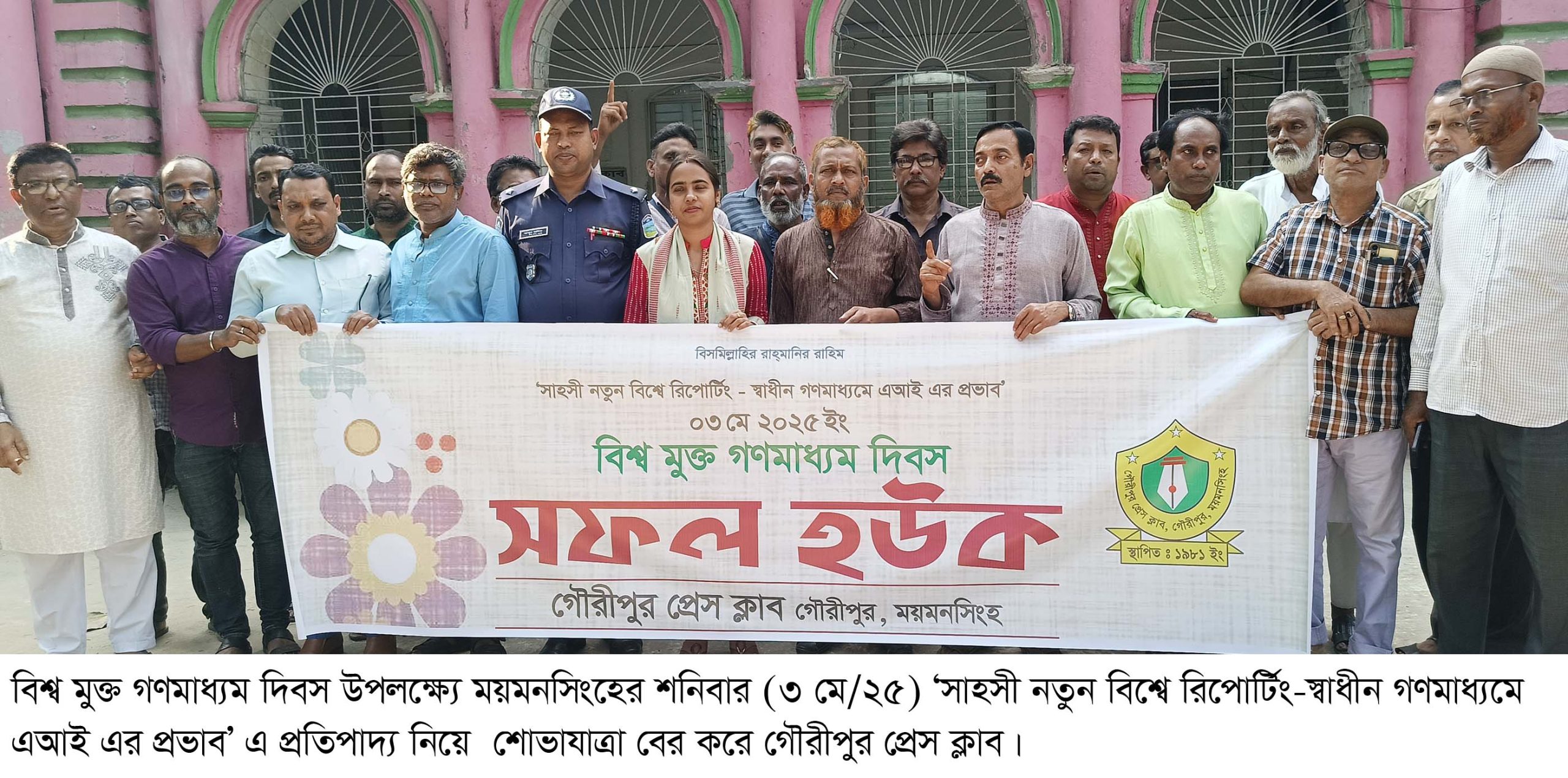 বিশ্ব মুক্ত গণমাধ্যম দিবস উপলক্ষ্যে স্বাধীন সাংবাদিকতার দাবিতে ময়মনসিংহের গৌরীপুরে র্যালী ও আলোচনা সভা করেছে কর্মরত সাংবাদিকরা। এ সময় সাংবাদিক সুরক্ষা আইন প্রণয়নসহ ১৪ দফা বাস্তবায়নের দাবি জানান তারা।