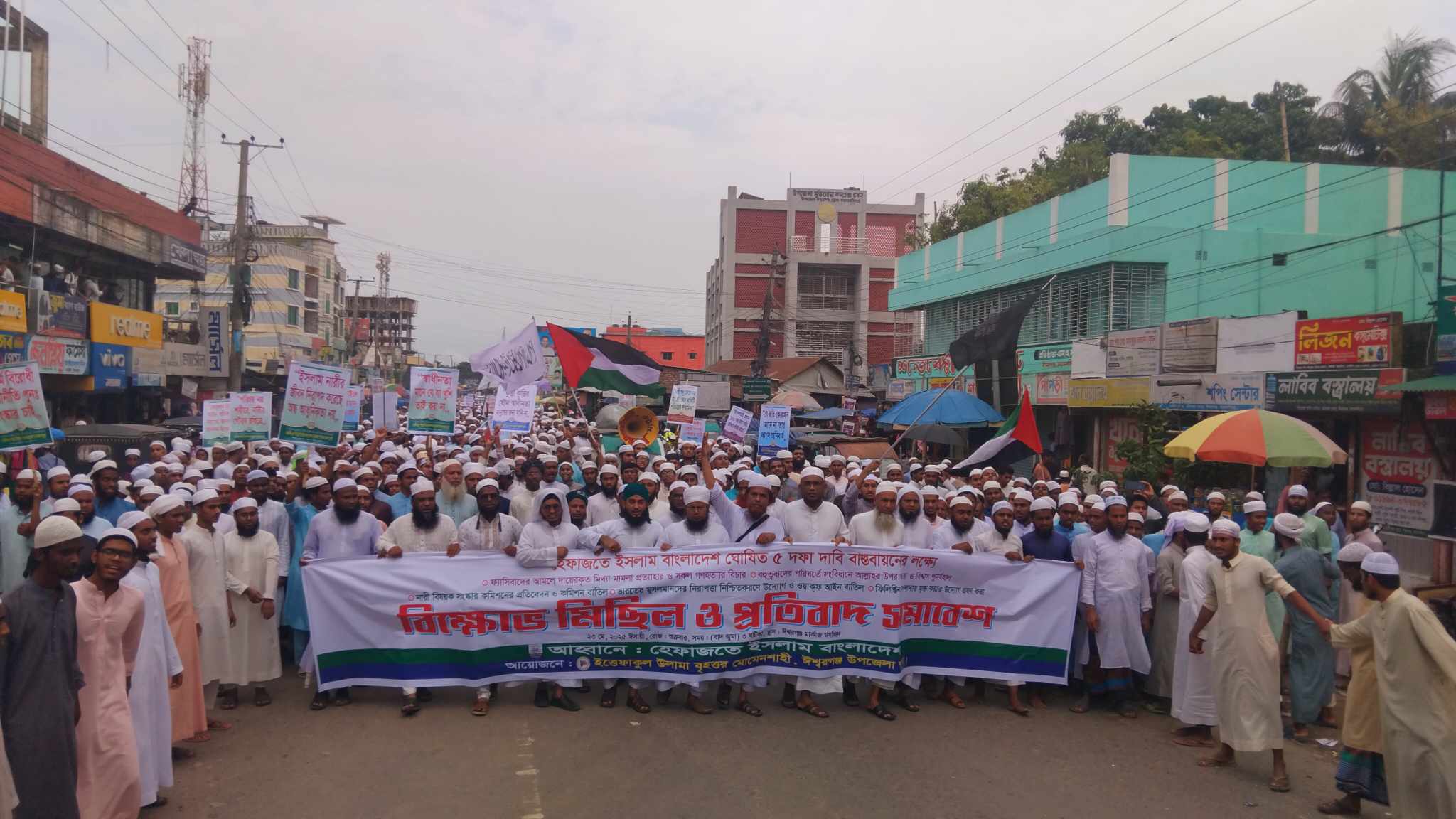 হেফাজতে ইসলাম বাংলাদেশ ৫ দফা দাবি বাস্তবায়নের লক্ষ্যে ময়মনসিংহের ঈশ্বরগঞ্জে বিক্ষোভ মিছিল ও প্রতিবাদ সমাবেশ করেছে। শুক্রবার (২৩ মে ২০২৫) বাদ জুমা হেফাজতে ইসলাম ঈশ্বরগঞ্জ উপজেলা শাখার আহবানে এবং ইত্তেফাকুল উলামা ঈশ্বরগঞ্জ উপজেলা শাখার আয়োজনে ওই বিক্ষোভ মিছিল ও প্রতিবাদ সমাবেশ করা হয়। মিছিলটি ঈশ্বরগঞ্জ মার্কাজ মসজিদের সামনে থেকে বের হয়ে পৌর শহরের প্রধান প্রধান সড়ক পদক্ষিণ শেষে উপজেলা পরিষদের সামনে গিয়ে সমাবেশের মধ্যে দিয়ে শেষ হয়।