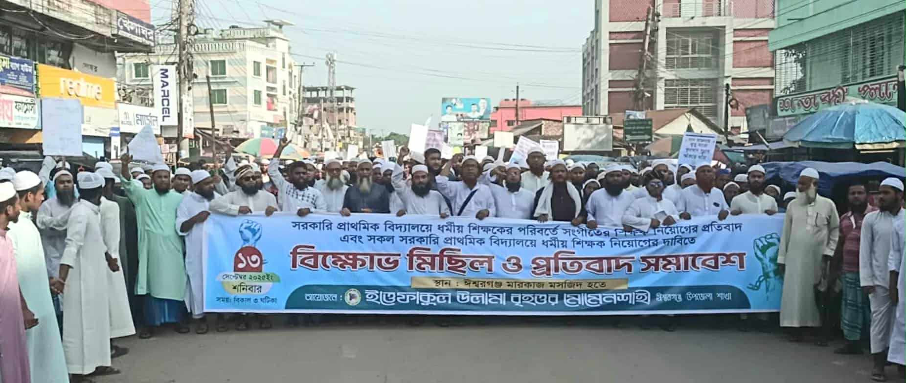 প্রাথমিক বিদ্যালয়ে নাচ-গানের শিক্ষক নিয়োগকে 'ইসলাম বিদ্বেষী' সিদ্ধান্ত আখ্যা দিয়ে তা বাতিলের দাবিতে ময়মনসিংহের ঈশ্বরগঞ্জে বিক্ষোভ করেছে ‘ইত্তেফাকুল উলামা বৃহত্তর মোমেনশাহী’।