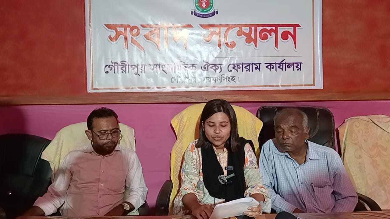 গৌরীপুর (ময়মনসিংহ) প্রতিনিধি: ময়মনসিংহের গৌরীপুর পৌর সভায় সংখ্যালঘু এক বিশ্ববিদ্যালয়ের শিক্ষার্থীর জমি দখলের পায়তারার অভিযোগ উঠেছে প্রতিবেশী জাহানারা গং এর বিরুদ্ধে। বুধবার (১৫ অক্টোবর) গৌরীপুর সাংবাদিক ঐক্য ফোরামের কার্যালয়ে এক সংবাদ সম্মেলনে লিখিত অভিযোগ করেছে বিশ্ববিদ্যালয় শিক্ষার্থী নীলাঞ্জনা সরকার শান্তনা।