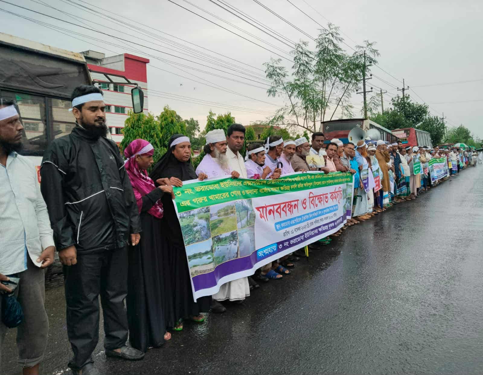 শনিবার (পহেলা নভেম্বর) সকালে ঢাকা ময়মনসিংহ মহাসড়কে কাফনের কাপড় পড়ে বিক্ষোভ মিছিল ও প্রায় ঘন্টা খানিক সময় মানববন্ধন করে ভুক্তভোগী কৃষক রা।