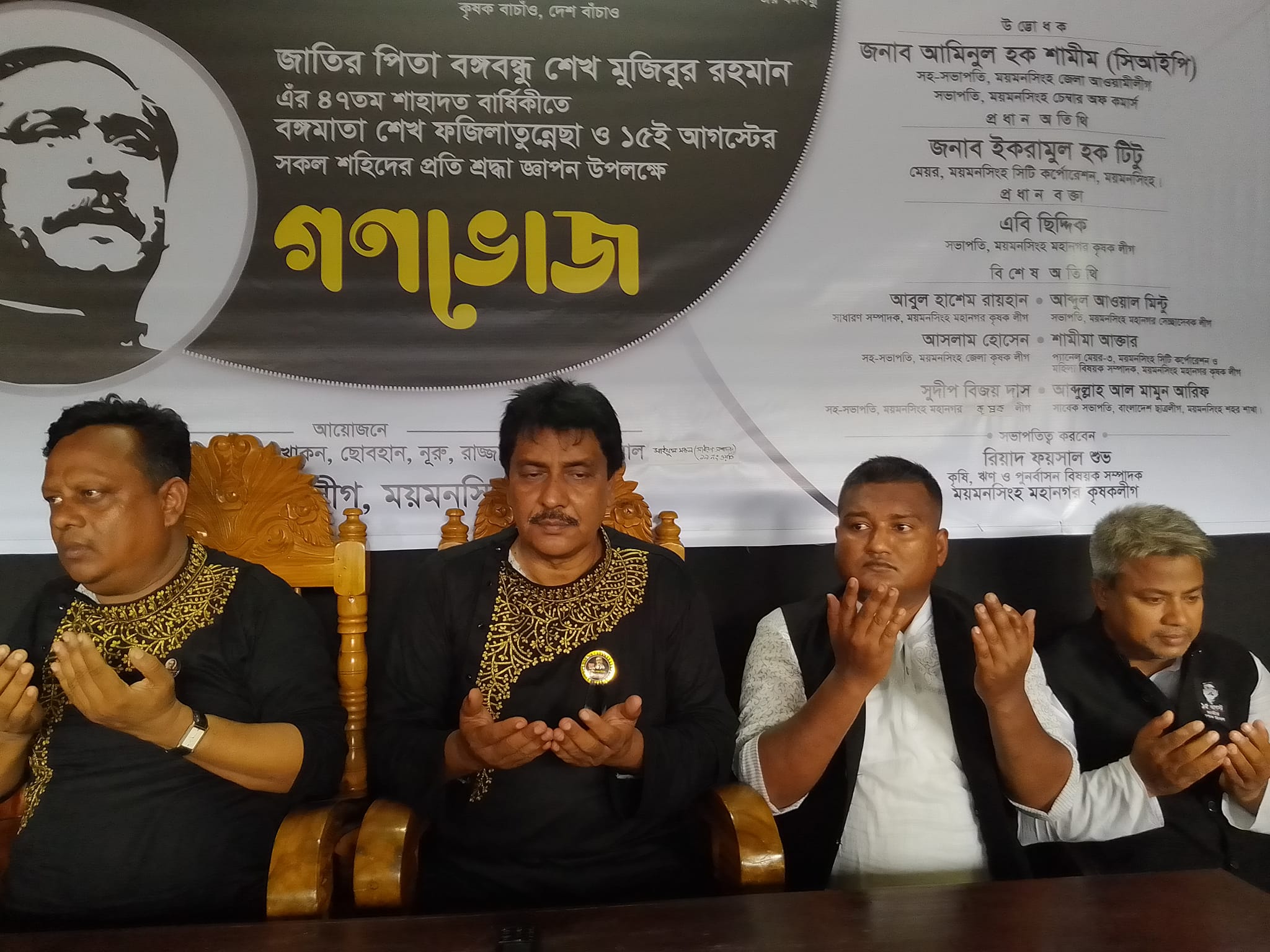গনভোজ ও দোয়া মাহফিলে প্রধান অতিথি হিসেবে উপস্থিত ছিলেন ময়মনসিংহ সিটি কর্পোরেশন এর সফল জননন্দিত মেয়র মোঃ ইকরামুল হক টিটু । বিশেষ অতিথি হিসেবে উপস্থিত ছিলেন ময়মনসিংহ মহানগর কৃষক লীগের প্রতিষ্ঠাতা সভাপতি এ, বি, ছিদ্দিক প্রতিষ্ঠাতা সাধারণ সম্পাদক আবুল হাসেম রায়হান , সহ সভাপতি নূর আলী তালুকদার সহ সভাপতি সুদীপ বিজয় দাস সংগ্রামী যুগ্ম সাধারণ সম্পাদক খোকন তালুকদার , মহিলা বিষয়ক সম্পাদক ও সিটি কর্পোরেশন এর প্যানেল মেয়র - ৩ শামীমা আক্তার কৃষক লীগ নেতা মামুন , স্থানীয় সরকার বিষয়ক সম্পাদক অমল কুমার সরকার শিল্প ও কুঠির বিষয়ক সম্পাদক আলমগীর হোসেন সাংস্কৃতিক বিষয়ক সম্পাদক সংগীত শিল্পী সাজ্জাদুর রহমান সাজু কৃষকলীগ নেতা আজাদ, ১৯ নং ওয়ার্ড কৃষকলীগ সভাপতি আব্দুস সোবহান ও রাসেল সহ বিভিন্ন পর্যায়ের নেতৃবৃন্দ উপস্থিত ছিলেন