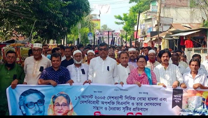 সিরিজ বোমা হামলার প্রতিবাদে ফুলবাড়িয়া উপজেলা আওয়ামী লীগের বিক্ষোভ মিছিল