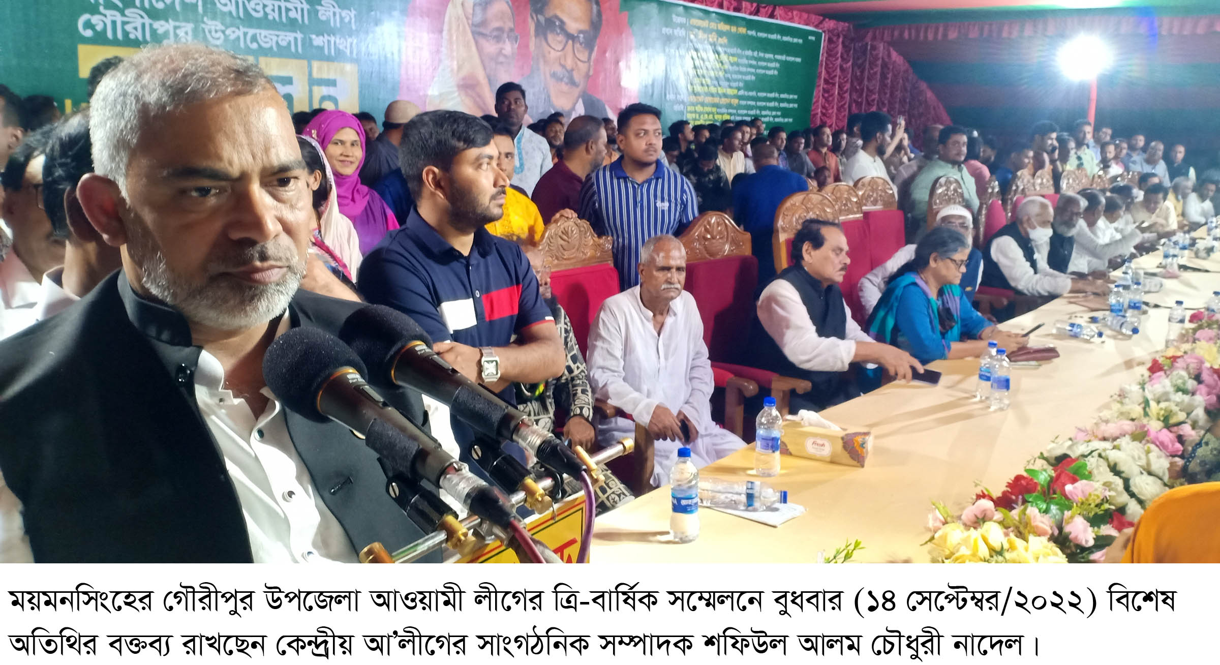 ময়মনসিংহের গৌরীপুর উপজেলা আওয়ামী লীগের ত্রি-বার্ষিক সম্মেলন বুধবার (১৪ সেপ্টেম্বর/২০২২) গৌরীপুর আরকে সরকারি উচ্চ বিদ্যালয় মাঠে অনুষ্ঠিত হয়। বিশেষ অতিথির বক্তব্যে কেন্দ্রীয় আ’লীগের সাংগঠনিক সম্পাদক শফিউল আলম চৌধুরী নাদেল বলেন, দলীয় শৃঙ্খলা-সিদ্ধান্ত মেনে চলতে হবে। বঙ্গবন্ধু’র আদর্শ অন্তরে ধারণ করতে হবে। আমাদের ঐক্যবদ্ধ প্রয়াসে ৭১’রের রাজাকার, ৭৫’রের খুনি ও স্বৈরাচারদের পতন ঘটিয়ে আবারও শেখ হাসিনার নেতৃত্বে নতুন সরকার গঠিত হবে। আদর্শের জায়গায় মুক্তিযুদ্ধের জায়গায় কোনো শৈথল্য দেখানোর সুযোগ নাই।