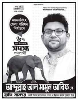 আসন্ন ময়মনসিংহ জেলা পরিষদ নির্বাচনে ময়মনসিংহ সদর (৬ নং ওয়ার্ড) সদস্য পদে মোঃ আব্দুল্লাহ আল মামুন আরিফকে হাতি মার্কা প্রতিক বরাদ্দ দেওয়া হয়েছে। ১৭ তারিখ সারাদিন হাতি মার্কায় ভোট দিন, এই শ্লোগান নিয়ে ময়মনসিংহ জেলা পরিষদ নির্বাচনে ময়মনসিংহ সদস্য ০৬ আসনে সদস্য পদপ্রার্থী ময়মনসিংহ শহর ছাত্রলীগের সাবেক সভাপতি আব্দুল্লাহ আল মামুন আরিফ, সোমবার ২৬ সেপ্টেম্বর (২০২২) দুপুরে ময়মনসিংহ জেলা প্রশাসকের সম্মেলন কক্ষে স্থানীয় সরকার বিভাগের উপ-পরিচালক ও জেলা সিনিয়র নির্বাচন কর্মকর্তা মোঃ সারোয়ার জাহানের কাছ থেকে এই হাতি প্রতিক গ্রহন করার পরপরই কর্মী সমর্থকদের শ্লোগানে শ্লোগানে মুখরিত হলো ময়মনসিংহ জেলা প্রশাসকের কার্যালয় প্রাঙ্গণ। জেলা প্রশাসক এর সম্মেলন কক্ষ থেকে নির্বাচনের প্রতিক বরাদ্দ দেওয়ার সাথে সাথে সদর উপজেলা ভোটার সহ জনগনের আস্থা ও ভালোবাসার সেবক মোঃ আব্দুল্লাহ আল মামুন আরিফ এর হাতি প্রতিক মার্কা সামাজিক যোগাযোগ মাধ্যম (ফেইসবুক) সাড়া ফেলে দেয়। এর আগে আসন্ন ১৭ অক্টোবর জেলা পরিষদের নির্বাচনকে সামনে রেখে সাধারণ সদস্য পদপ্রার্থী হিসেবে সদর উপজেলা প্রতিটি ইউনিয়ন পরিষদের ভোটারদের সাথে মতবিনিময় তিনি তার যোগ্যতা ও কর্মদক্ষতার পরিচয় দিয়েছেন সাবেক ছাত্রনেতা আব্দুল্লাহ আল মামুন আরিফ রাজনৈতিক জীবন রাজপথ থেকে উঠে আসা একজন বলিষ্ঠ ছাত্রনেতা। এছাড়াও তিনি সমাজসেবক ও সামাজিক ব্যক্তিত্ব হিসাবে ময়মনসিংহে সুপরিচিত। সাবেক ছাত্রনেতা আব্দুল্লাহ আল মামুন আরিফ বলেন, আধুনিক বাংলাদেশর কারিগর ও অন্যতম সফল রাষ্ট্রনায়ক মাননীয় প্রধানমন্ত্রী জননেত্রী শেখ হাসিনার হাতকে শক্তিশালী করতে ও ময়মনসিংহ সদর উপজেলায় উন্নয়নের ধারাকে অব্যাহত রাখতে জেলা পরিষদ নির্বাচনে সদর উপজেলায় সদস্য প্রাথী হিসাবে আমি হাতি মার্কায় ভোট ও সর্বস্তরের জনগনের দোয়া ও সহযোগিতা কামনা করছি এছাড়াও সদর উপজেলার সদস্য পদে নির্বাচনে প্রতিদ্বন্দ্বিতা করবেন আরো তিনজন তারা হলেন, টিউবওয়েল মার্কা নিয়ে মোঃ মমতাজ উদ্দিন, ঘুড়ি মার্কা নিয়ে মোঃ আল-আমিন আলভী,তালা মার্কা নিয়ে ওয়াহিদুজ্জামান মিলন। আগামী ১৭ অক্টোবর জেলা পরিষদের নির্বাচন অনুষ্ঠিত হবে।