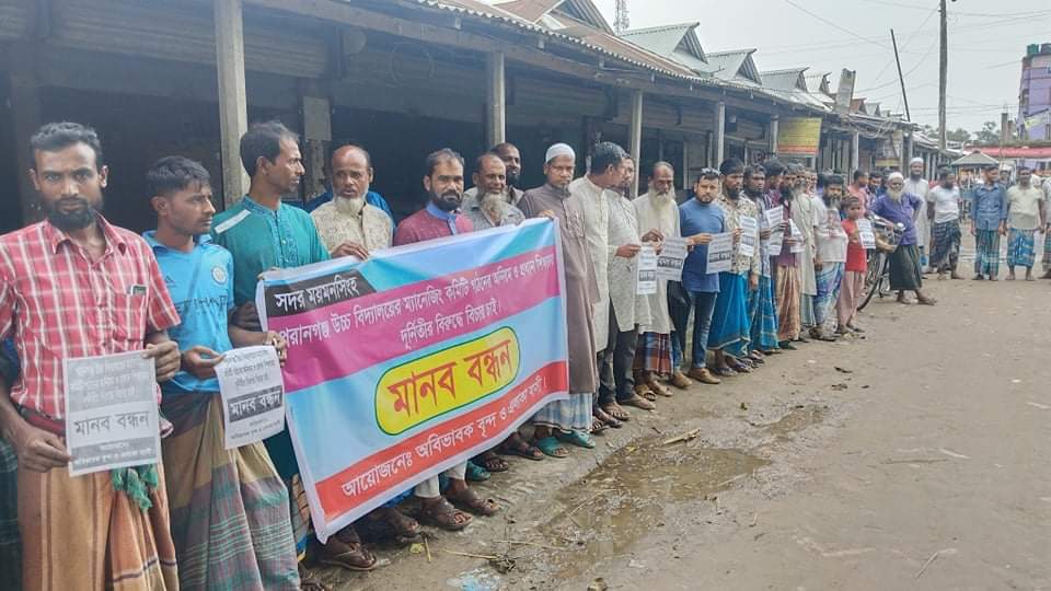 স্টাফ রিপোর্টার, ময়মনসিংহ। ময়মনসিংহ সদর উপজেলা পরানগঞ্জ উচ্চ বিদ্যালয়ের ম্যানেজিং কমিটি গঠনে অনিয়ম ও প্রধান শিক্ষকের দূর্নীতি র বিরুদ্ধে বিচার চেয়ে মানববন্ধন অনুষ্ঠিত হয়েছে। ২৯ সেপ্টেম্বর বৃহস্পতিবার দুপুরে বিদ্যালয়ের সামনে ঘন্টাব্যাপী মানববন্ধন কর্মসূচি পালন করে সাবেক শিক্ষার্থী, অভিভাবক ও স্থানীয় এলাকাবাসী। এ সময়ে বক্তব্য রাখেন পরানগঞ্জ ইউনিয়ন আওয়ামী লীগের সহ সভাপতি আলহাজ্ব শাহজাহান সরকার বাচ্চু,বোররচর ইউনিয়ন জাতীয় পার্টির সভাপতি ও জেলা মুক্তিযোদ্ধা সম্পাদক মোঃ তফাজ্জল হোসেন,৩ নং ওয়ার্ড সাবেক ইউপি সদস্য মোঃ আব্দুস সোবহান, অভিভাবক সদস্য ও আওয়ামী লীগের নেতা মোঃ আকবর আলী,পরানগঞ্জ বাজার পল্লী চিকিৎসক ডাঃ আরিফ রব্বানী, সাবেক শিক্ষার্থী মোঃ মিরাজ আলী প্রমূখ।