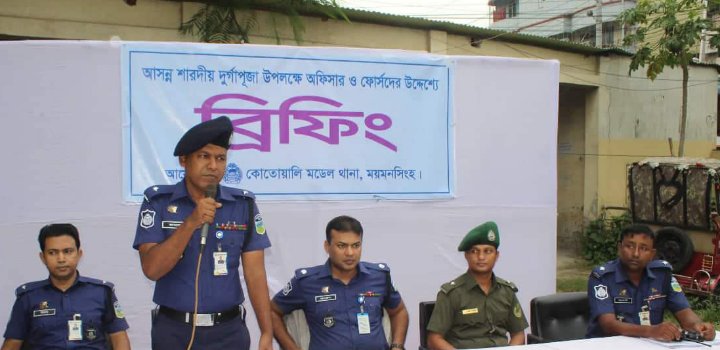 আসছে দুর্গাপূজায় বিভাগীয় নগরীর আইন শৃংখলা নিয়ন্ত্রণ, চুরি ছিনতাই রোধ ও মাদকমুক্ত শান্তিময়, নিরাপদ বাসযোগ্য নগর উপহার দিতে ময়মনসিংহের কোতোয়ালি মডেল থানা পুলিশের আয়োজনে অফিসার ফোর্সদের উদ্দেশ্যে ব্রিফিং করা হয়। শুক্রবার বিকালে কোতোয়ালি মডেল থানার অভ্যন্তরে এই ব্রিফিং করা হয়।