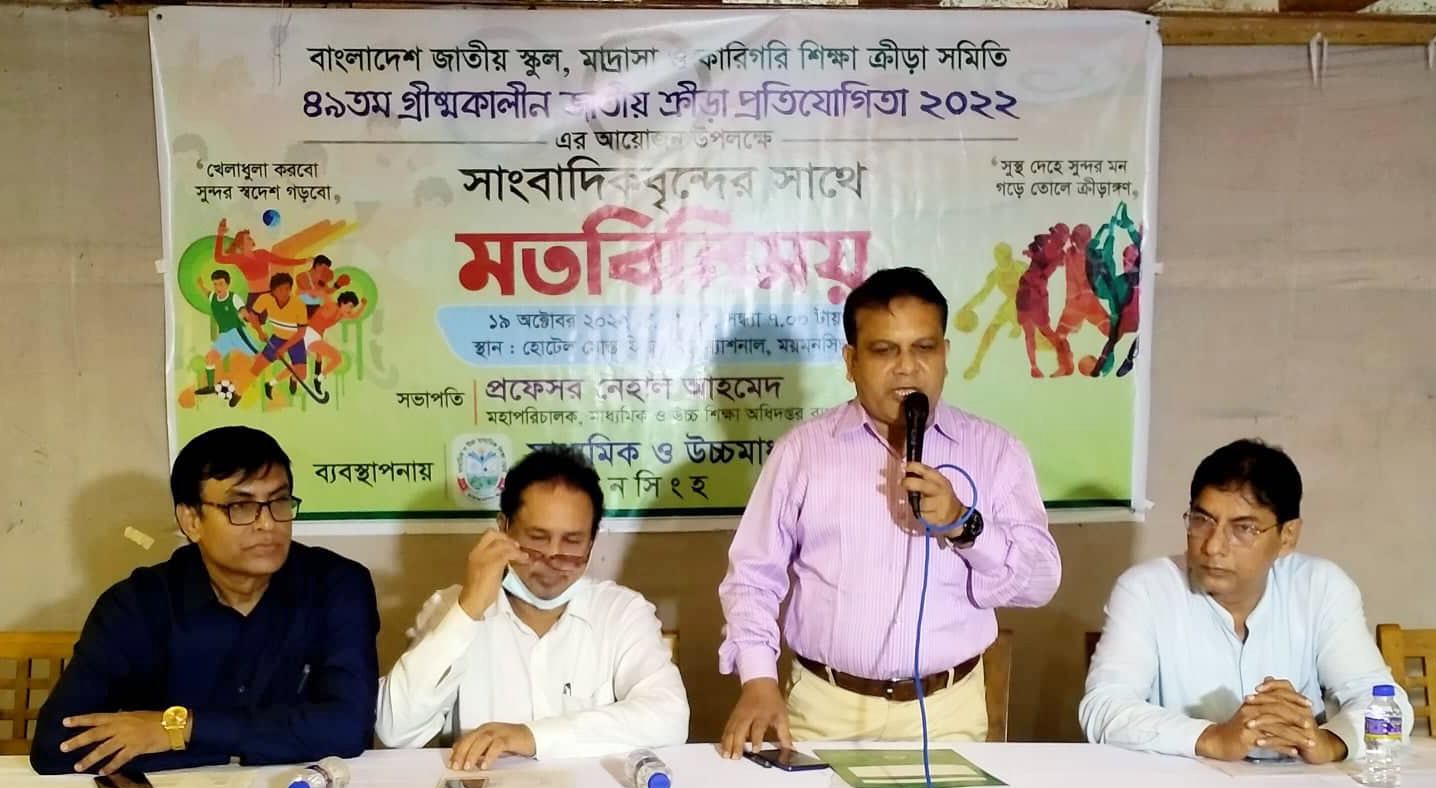 স্টাফ রিপোর্টার, ময়মনসিংহ ॥ বাংলাদেশ জাতীয় স্কুল, মাদ্রাসা ও কারিগরি শিক্ষা ক্রীড়া সমিতির আয়োজনে ৪৯ তম গ্রীষ্মকালীন জাতীয় ক্রীড়া প্রতিযোগিতা ২০২২ নিয়ে বুধবার সন্ধ্যায় ময়মনসিংহের একটি হোটেলে সাংবাদিকদের সাথে মতবিনিময় সভা অনুষ্ঠিত হয়। এতে সভাপতিত্ব করেন ঢাকা বাংলাদেশ মাধ্যমিক ও উচ্চ শিক্ষা অধিদপ্তরের মহাপরিচালক প্রফেসর নেহাল আহমেদ। সভায় বক্তব্য রাখেন ময়মনসিংহ মাধ্যমিক ও উচ্চ মাধ্যমিক শিক্ষা বোর্ডের চেয়ারম্যান প্রফেসর ডঃ গাজী হাসান কামাল। উপস্থিত ছিলেন ময়মনসিংহ শিক্ষা বোর্ডের সচিব প্রফেসর কিরিট কুমার দত্ত, শিক্ষা ভবন ঢাকার উপপরিচালক আক্তারুজ্জামান ভুইয়া, ময়মনসিংহ অঞ্চলের আঞ্চলিক পরিচালক (শিক্ষা) প্রফেসর আজহারুল ইসলাম।