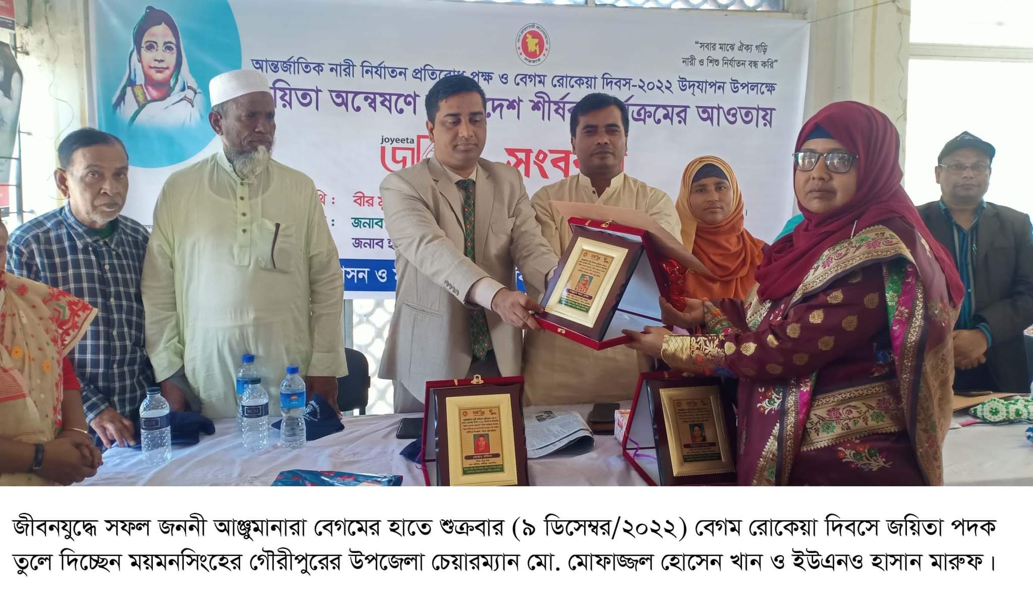 শুক্রবার (৯ ডিসেম্বর/২০২২) এ সফল জননীর হাতে বেগম রোকেয়া দিবসে জয়িতা পদক তুলে দেন উপজেলা চেয়ারম্যান মো. মোফাজ্জল হোসেন খান এবং ইউএনও হাসান মারুফ। এছাড়াও অর্থনৈতিকভাবে সাফল্য অর্জনকারী নারী হিসাবে পৌর শহরের পূর্বদাপুনিয়ার আবু জাফর মো. সাদেকের স্ত্রী হোমাইয়া চৌধুরী, শিক্ষা ও চাকুরী ক্ষেত্রে সাফল্য অর্জনকারী হিসাবে কালিপুর মধ্যম তরফের মোছা. রোজিনা আক্তার, নির্যাতনের বিভীষিকা মুছে ফেলে নতুন উদ্যমে জীবন শুরু করেছেন ক্যাটাগরিতে হাটশিরা গ্রামের আবু বকরের কন্যা মোছা. মদিনা ও সমাজ উন্নয়নে অসামান্য অবদানের স্বীকৃতি হিসাবে গৌরীপুর পৌরসভার কাউন্সিলর দিলুয়ারা আক্তার জয়িতা পদক প্রদান করা হয়।