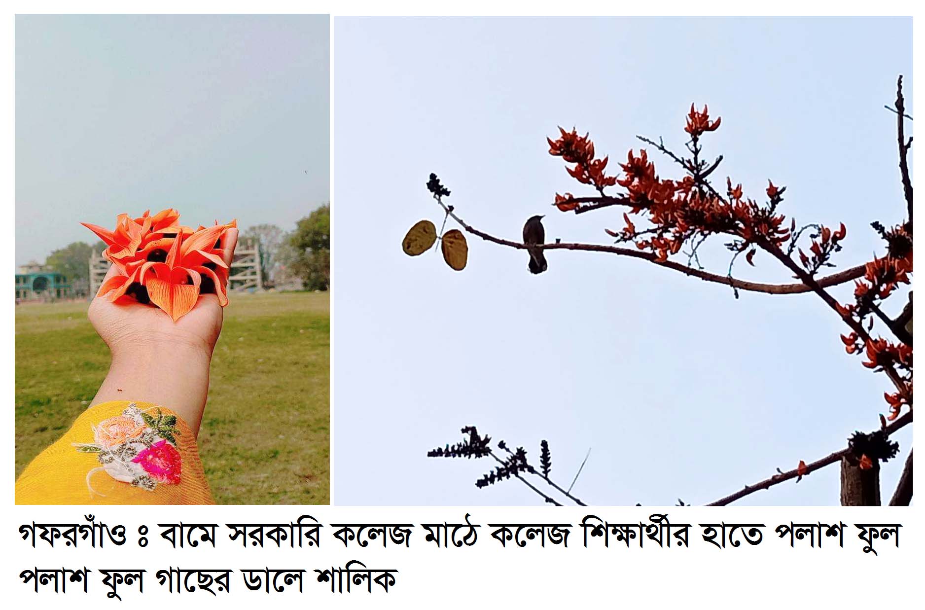 ময়মনসিংহের গফরগাঁও উপজেলা খান বাহাদুর ইসমাইল রোডের ব্রহ্মপুত্র নদের কুল ঘেষে গফরগাঁও সরকারি কলেজ। আর এই সরকারি কলেজের ইংরেজী বিভাগের শিক্ষক অনুপ সাদী ২০০৮সালের মাঝামাজি ঢাকা বৃক্ষ মেলা থেকে ৩০০ টাকায় ক্রয় করে সরকারি কলেজ মাঠে লাগিয়েছিলেন ২টি পলাশ ফুলের চারা। আজ সেটিতে এসেছে বসন্ত রাঙ্গা রুপ ও যৌবন। আগন্তক পথচারীরা আসা যাওয়ার সময় একবার হলেও তাকিয়ে দেখে পলাশ ফুলের দিকে। পলাশ ফুলের কাছে গিয়ে কথা হয় কলেজের অর্নাস ৩য় বর্ষের ছাত্রী পুষ্প আক্তারের সাথে। জানতে চাইলে তিনি বলেন, এটি কি ফুলের গাছ জানিনা। তবে এইটুকু বলতে পারি সাদি স্যার লাগিয়েছিলেন দুটি চারা। বিগত দিনে এরকম সুন্দর ফুল গাছ আমি দেখিনি। পলাশ ফুলে বসে শালিক, বউ কথা কও, কোকিল সহ বিভিন্ন পাখি লাফালাফি করে।