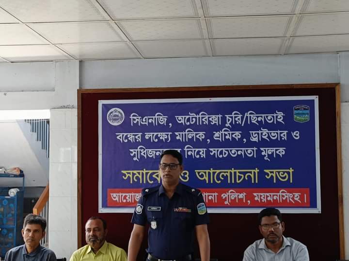 ময়মনসিংহ জেলার মুক্তাগাছা থানার অফিসার ইনচার্জ মোঃ আবদুল মজিদ তত্ত্বাবধানে ৩ এপ্রিল ২০২৩ সোমবার জেলার পুলিশ সুপার মোঃ মাসুম আহমেদ ভূঁইয়া ও অতিরিক্ত পুলিশ সুপার, সদর সার্কেল ইঞ্জিনিয়ার মোঃ শাহিনুল ইসলাম ফকির সার্বিক দিক নির্দেশনা মোতাবেক চলতি রমজান এবং আসন্ন পবিত্র ঈদ-উল-ফিতর উপলক্ষে অতিরিক্ত ভাড়া ও সিএনজি, অটোরিক্সা চুরি, ছিনতাই রোধকল্পে মালিক, শ্রমিক, ড্রাইভার ও সুধিজনদের নিয়ে মুক্তাগাছা থানা কম্পাউন্ডে সচেতনতামূলক আলোচনা সভা অনুষ্ঠিত হয়। উক্ত আলোচনা সভায় বিভিন্ন মটর শ্রমিক ইউনিয়নের নেতৃবৃন্দ উপস্থিত হয়ে চালকদের উদ্দেশ্যে গুরুত্বপূর্ণ বক্তব্য প্রদান করে। তাছাড়াও উক্ত আলোচনা সভায় চালকদের যত্রতত্র পার্কিং, রাত্রিতে অপরিচিত যাত্রীদের বিষয়ে অধিক সচেতনতা অবলম্বন এবং মধ্যরাতের পরে (বিশেষ প্রয়োজন ব্যতীত) রির্জাভ ট্রিপে না যাওয়ার বিষয়ে বিভিন্ন গুরুত্বপূর্ণ দিক নির্দেশনা মূলক বক্তব্য প্রদান করেন মুক্তাগাছা থানার অফিসার ইনচার্জ মোঃ আবদুল মজিদ। পাশাপাশি আমাদের এই অনুষ্ঠানের সার্বিক নজর থাকবে। এ সময় উপস্থিত ছিলেন ট্রাফিক বিভাগের ইন্সপেক্টর মাহবুবুর রহমানসহ অন্যান্য পুলিশ কর্মকর্ত।