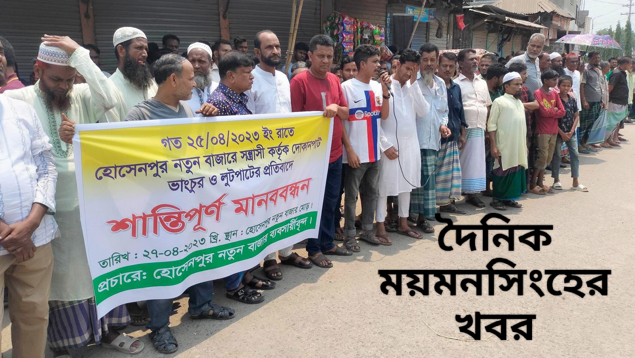 কিশোরগঞ্জের হোসেনপুর নতুন বাজারে সন্ত্রাসী কর্তৃক দোকান পাটে ভাংচুর ও লুটপাটের প্রতিবাদে মানববন্ধন ও বিক্ষোভ মিছিল কর্মসূচী পালন করেছে ব্যবসায়ীরা।