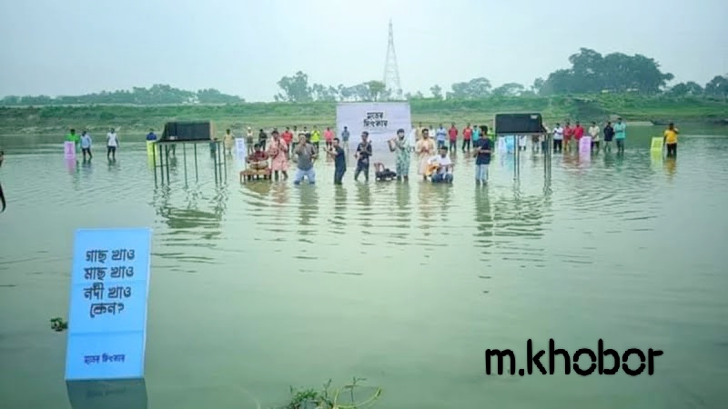প্রতিবাদ কর্মসূচিতে ব্রহ্মপুত্রের বুকে হাঁটুপানিতে সাজানো হয় প্রতীকী মঞ্চ। একটি টেবিলে রাখা হয় কিছু খাবার; আমরা যেই পানিকে জীবনের অপর নাম বলে জানি কিন্তু সেই পানিই ছিলো না। যেন পানির জন্য হাহাকার। টেবিলের পেছনে বিশাল ব্যানারের পাশে ছোট ছোট প্ল্যাকার্ড পুতে রাখা হয়েছিলো। তারা যেন নীরবে জানান দিচ্ছিল মৃতপ্রায় এ নদের আর্তনাদের কথা।