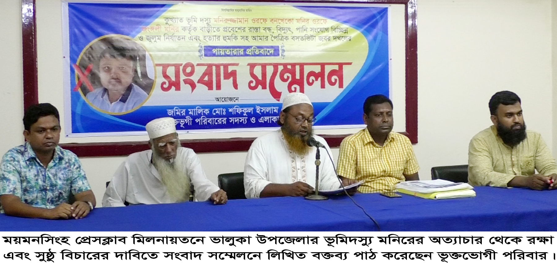 স্টাফ রিপোর্টার, ময়মনসিংহ। ময়মনসিংহের ভালুকায় মনিরুজ্জামান ওরফে বনখেকো মনির ওরফে জঙ্গলি মনির কর্তৃক ভুমি মালিকদের নিজ বাড়িতে প্রবেশের রাস্তা বন্ধ, হত্যার হুমকি সহ অত্যাচার ও নির্যাতনের প্রতিবাদে সংবাদ সম্মেলন করেছে ভুক্তভোগী কয়েক পরিবার। রবিবার দুপুরে ময়মনসিংহ প্রেসক্লাবে এই সংবাদ সম্মেলন অনুষ্ঠিত হয়।