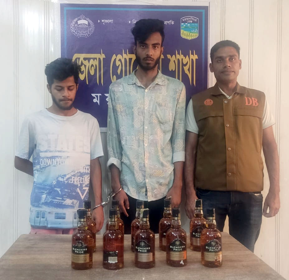 পুলিশ জানায়, এসআই(নিঃ) আমিনুল ইসলাম সংগীয় অফিসার ফোর্সসহ অভিযান পরিচালনা করে কোতোয়ালী থানাধীন শম্ভুগঞ্জ এলাকা থেকে ২৪ মে ১৭.৩৫ ঘটিকায় ১০ বোতল ভারতীয় মদসহ মাদক ব্যবসায়ী শেখ মোহাম্মদ জিসান (১৯), পিতা- মৃত শেখ মোহাম্মদ আলী ও মোঃ হাসিবুল হক (২০) ময়মনসিংহদ্বয়কে গ্রেফতার করেন।