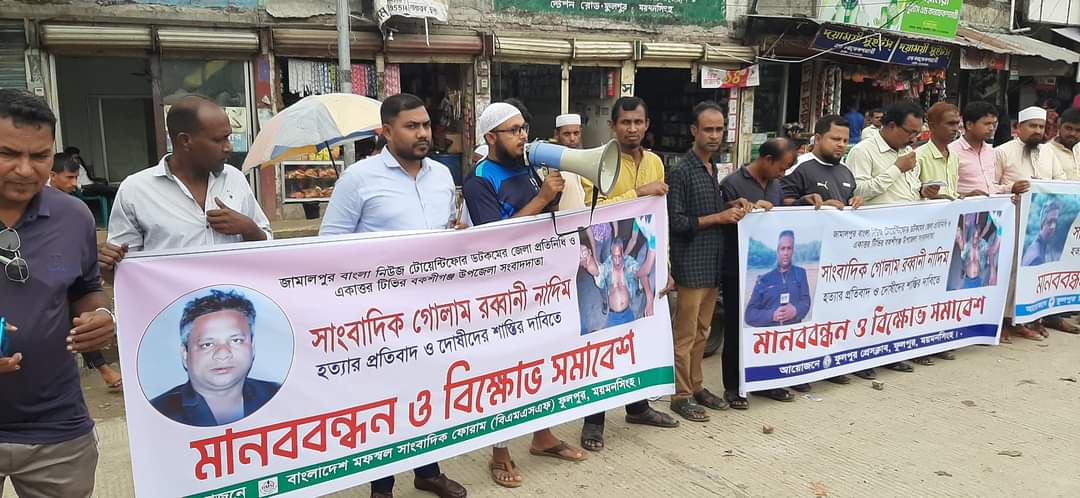 জামালপুরের বাংলা নিউজ টোয়েন্টিফোর ডটকমের জেলা প্রতিনিধি ও একাত্তর টিভির বকশীগঞ্জ উপজেলা সংবাদদাতা সাংবাদিক গোলাম রব্বানী নাদিম হত্যার প্রতিবাদ ও দোষীদের শাস্তির দাবীতে (১৮ জুন) রোববার দুপুর ২ টায় ফুলপুর গোল চত্বরে ফুলপুর প্রেসক্লাব, বাংলাদেশ মফস্বল সাংবাদিক ফোরাম (বিএমএসএফ) ফুলপুর উপজেলা শাখা ও ফুলপুর রিপোর্টার্স ইউনিটির উদ্যোগে মানববন্ধন ও বিক্ষোভ সমাবেশ অনুষ্ঠিত হয়েছে। এতে বক্তব্য রাখেন ফুলপুর প্রেসক্লাব সভাপতি মোঃ নাজিম উদ্দিন, ফুলপুর রিপোর্টার্স ইউনিটির সভাপতি ক্বারী সুলতান আহম্মাদ, বাংলাদেশ মফস্বল সাংবাদিক ফোরাম (বিএমএসএফ) ফুলপুর উপজেলা শাখার সভাপতি মিজানুর রহমান আকন্দ, সাধারণ সম্পাদক আবু রায়হান, আইন বিষয়ক সম্পাদক বাহার উদ্দিন, প্রচার সম্পাদক মফিদুল ইসলাম, সিনিয়র সাংবাদিক আকিকুল ইসলাম প্রমুখ।