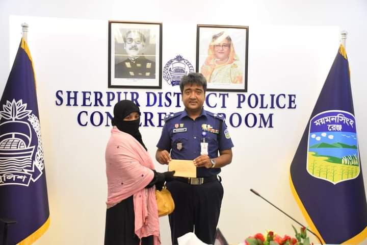 কর্তব্যরত অবস্থায় জীবন উৎসর্গকারী পুলিশ সদস্যের পরিবারের অনুকূলে ইন্সপেক্টর জেনারেল অব পুলিশ, বাংলাদেশ মহোদয় কর্তৃক প্রদত্ত নগদ অর্থ প্রদান করেন পুলিশ সুপার, শেরপুর