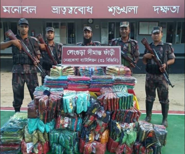গত ১৫ জুলাই ২০২২ তারিখ আনুমানিক ১৫০০ ঘটিকায় নেত্রকোণা ব্যাটালিয়ন (৩১ বিজিবি) এর অধীনস্থ নেত্রকোনা জেলার কলমাকান্দা উপজেলার ৫ নং লেংগুড়া ইউনিয়নে অবস্থিত লেংগুড় বিওপি হতে নিজস্ব গোয়েন্দা তথ্যের ভিত্তিতে অত্র ব্যাটালিয়নের অধিনায়ক লেঃ কর্ণেল এ এস এম জাকারিয়া, পিএসসি এর নেতৃত্বে ১৭ সদস্যের একটি টহল দল কর্তৃক চোরাচালান বিরোধী অভিযান পরিচালনাকালে সীমান্ত মেইন পিলার ১১৬৯ হতে আনুমানিক ১০০ গজ বাংলাদেশের অভ্যন্তরে ভরতপুর নামক এলাকা হতে পরিত্যক্ত মালিকবিহীন অবস্থায় ভারতীয় শাগুন শাড়ি-৩৫৯ পিস এবধূ সালমা সিল্ক শাড়ি-২১ পিস জব্দ করা হয় যার সর্বমোট সিজার মূল্য-১১,৬১,০০০/-(এগারো লক্ষ একষট্টি হাজার) টাকা। জব্দকৃত চোরাচালানী মালামাল নেত্রকোনা কাষ্টমস্ অফিসে জমা করা হবে।