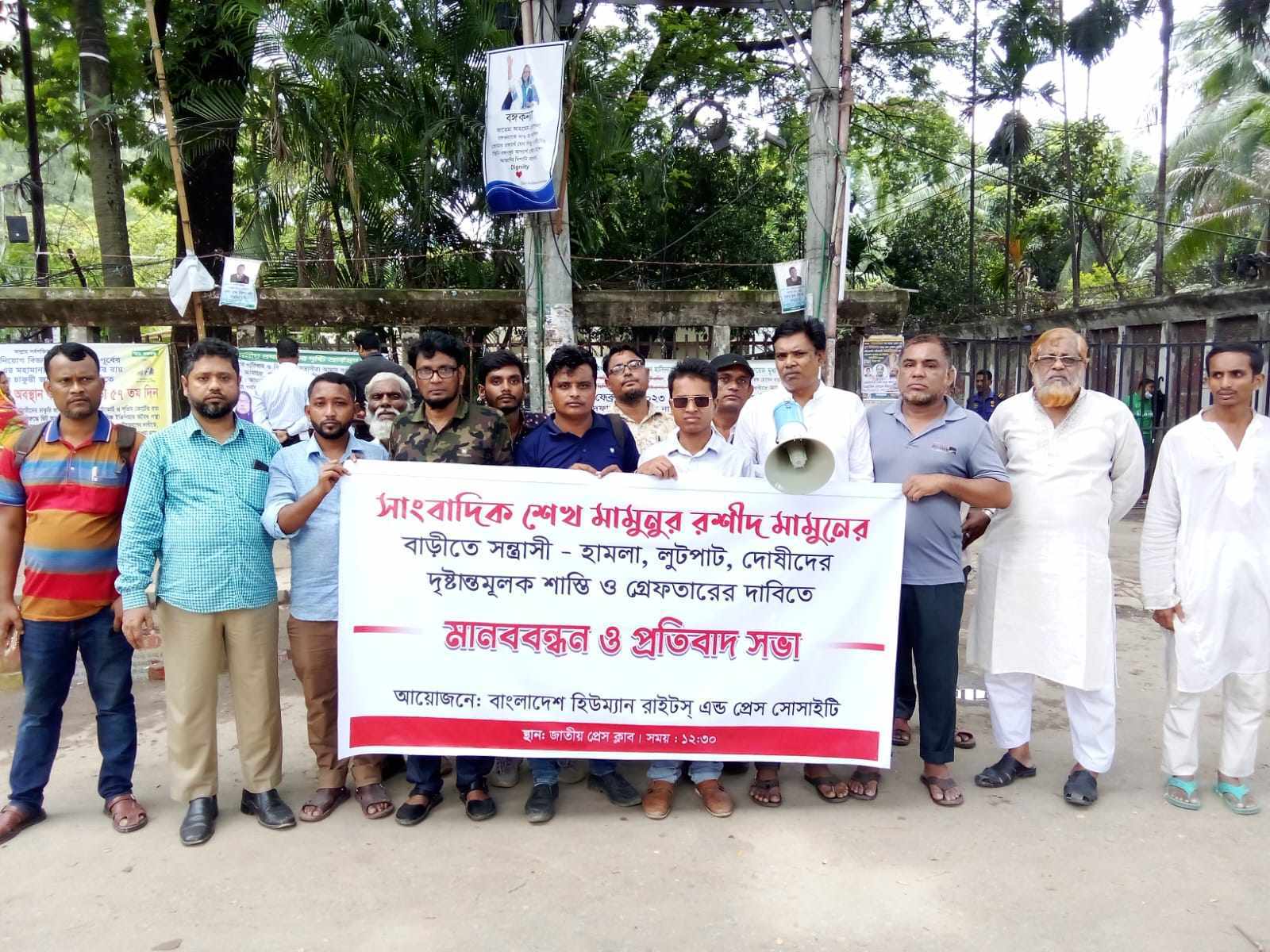 অনুষ্ঠানের সভাপতিত্ব করেন বাংলাদেশ হিউম্যান রাইটস অ্যান্ড প্রেস সোসাইটির চেয়ারম্যান দৈনিক স্বাধীন সংবাদ পত্রিকার সম্পাদক প্রকাশক মোঃ আনোয়ার হোসেন আকাশ।অতিথিরা বক্তব্যে বলেন সাংবাদিক মামুনুর রশিদ মামুনের বাড়িতে যে অতর্কিত সন্ত্রাসী হামলা,লুটপাট কারিদের অতি দ্রুত গ্রেফতার না করলে আমাদের এই আন্দোলন অব্যাহত থাকবে।
