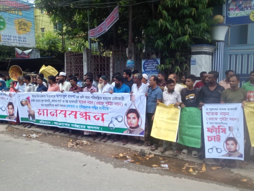 বক্তাগণ তাদের বক্তব্য বলেন, এলাকার চিহ্নিত মাদক ব্যবসায়ী ও অস্ত্র ব্যবসায়ী ঘাতক নয়ন (ওরফে পুইট্টা নয়ন) ও তার সহযোগীরা এলাকায় প্রায় সময় এমন অন্যায় করে আইনের তোয়াক্কা না করে পার পেয়ে যায়। ঈদের দিন প্রকাশ দিবালোকে আশরাফুল বাদশাকে গুলি করে। ঘটনার এতদিন পার হয়ে গেলেও পুলিশ এখনো পর্যন্ত কাউকে গ্রেফতার করতে পারেনি। তাই এলাকা বাসীর পক্ষ থেকে এমন ঘটনা যেন আর না ঘটে সেজন্য দ্রুত আসামিদের গ্রেফতার করে আইনের আওতায় এনে দৃষ্টান্তমূলক শাস্তির দাবি জানানো হয়।