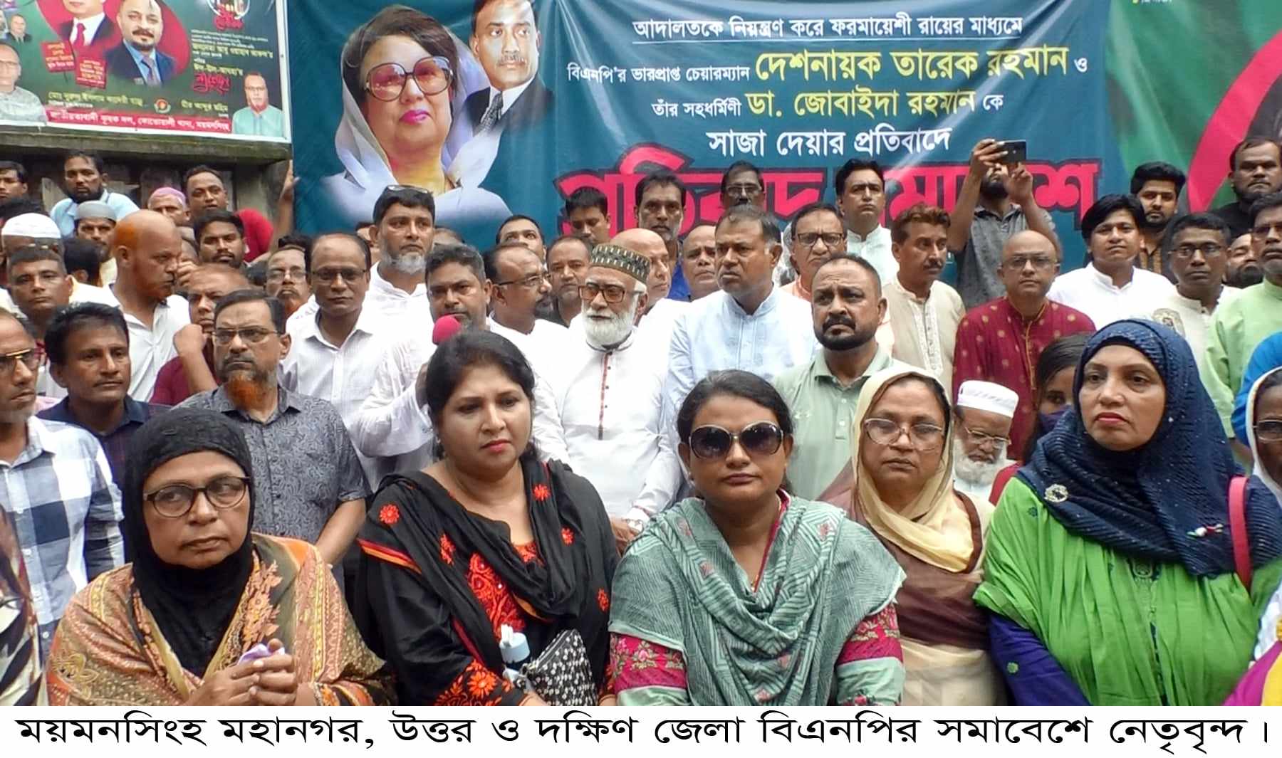 বিএনপির ভারপ্রাপ্ত চেয়ারম্যান তারেক রহমান ও তার সহধর্মিনী ডা. জোবাইদা রহমানকে সাজা দেয়ার প্রতিবাদে ময়মনসিংহে প্রতিবাদ সমাবেশ করেছে ময়মনসিংহ মহানগর, উত্তর ও দক্ষিণ জেলা বিএনপি। বিকেলে দলীয় কার্যালয়ের সামনে মহানগর বিএনপির আহ্বায়ক অধ্যাপক এ কে এম শফিকুল ইসলামের সভাপতিত্বে সভায় বক্তব্য রাখেন উত্তর জেলা বিএনপির আহ্বায়ক অধ্যাপক এ কে এনায়েত উল্লাহ কালাম, মহানগর বিএনপির যুগ্ম আহ্বায়ক আবু ওয়াহাব আকন্দ, দক্ষিণ জেলার যুগ্ম আহ্বায়ক ফকরউদ্দিন আহাম্মদ বাচ্চু ও আলমগীর মাহমুদ আলম, উত্তর জেলার যুগ্ম আহ্বায়ক মোতাহার হোসেন তালুকদার, সাবেক এমপি নূরুল কবীর শাহীন, পাগলা থানা সভাপতি ডা. মোফাখারুল ইসলাম রানা, অ্যাডভোকেট নূরুল হক, কাজী রানা, শাহ শিব্বির আহম্মদ বুলু, অ্যাডভোকেট এম এ হান্নান খান, কায়কোবাদ মামুন, এ কে এম মাহবুবুল আলম, শামীম আজাদ, এনামুল হক আকন্দ লিটন, যুবদলের দক্ষিণ জেলা সভাপতি রোকনুজ্জামান সরকার রোকন, মহানগর সাধারণ সম্পাদক জোবায়েদ হোসেন শাকিল সহ বিএনপি ও অঙ্গ সংগঠনের নেতৃবৃন্দ। এরআগে বিভিন্ন এলাকা থেকে খন্ড খন্ড মিছিল সহকারে সমাবেশে যোগ দেয় হাজারো নেতাকর্মী। বক্তারা ফরমায়েশী রায়ের তীব্র প্রতিবাদ জানান।