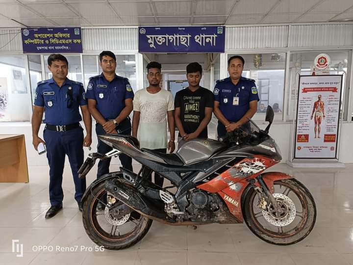 ময়মনসিংহ মুক্তাগাছা থানার অফিসার ইনচার্জ মোঃ আব্দুল মজিদ জানান, বুধবার ২৩ আগস্ট বিকাল ৪:৩০ ঘটিকার সময় বিশ্বস্ত সোর্সের মাধ্যমে গোপন সংবাদের প্রেক্ষিতে জানা যায় যে, অত্র মুক্তাগাছা থানাধীন ভাবকির মোড়ে YAMAHA (VERSON-2) R-15 চোরাই মটর সাইকেল ক্রয়-বিক্রয়ের জন্য ২ জন লোক অবস্থান করছে। উক্ত সংবাদের সত্যতা যাচাইয়ের জন্য মুক্তাগাছা থানার একটি টিম ঘটনাস্থলে পৌছিলে পুলিশের উপস্থিতি টের পেয়ে YAMAHA (VERSON-2) R-15 ফেলে পালানোর চেষ্টাকালে আসামী মোঃ মতিউর রহমান @ মতি (২০) মোঃ আশরাফুল ইসলাম (২২) দ্বয়কে আটক করেন। ধৃত আসামীদের জিজ্ঞাসাবাদে আসামীদ্বয় স্বীকার করে যে, উক্ত মোটর সাইকেলটি তাহারা ঢাকা জেলার আশুলিয়া থানা এলাকা হইতে চুরি করিয়া আনিয়া ঘটনাস্থলে বিক্রয়ের জন্য অবস্থান করছিলেন। তাৎক্ষনিক ঘটনাস্থলে উপস্থিত সাক্ষীদের মোকাবেলায় চোরাই মটর সাইকেলটি জব্দ তালিকা মূলে জব্দ করিয়া থানায় নিয়ে আসা হয়। পরবর্তীতে ধৃত আসামীদ্বয়ের বিরুদ্ধে মুক্তাগাছা থানার মামলা নং-২৪(৮)২৩, ধারা- ৪১৩ পেনাল কোড রুজু করে গ্রেফতারকৃত আসামীদ্বয়কে বৃহস্পতিবার ২৪ আগস্ট বিজ্ঞ আদালতে প্রেরন করা হয়েছে।
