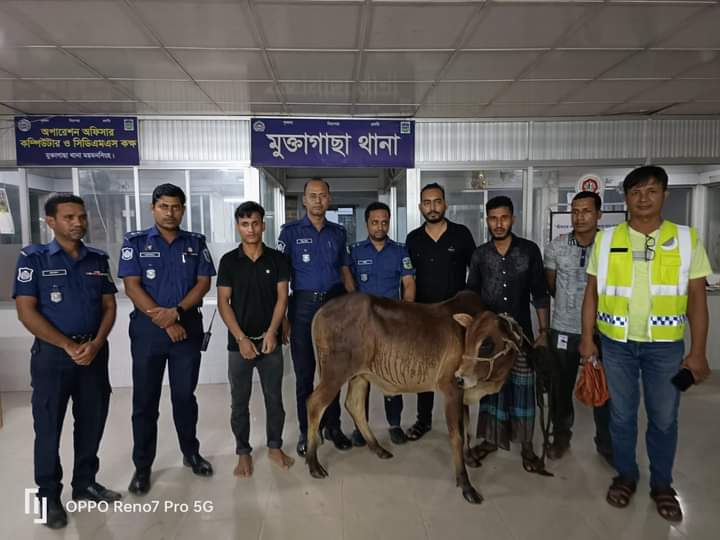 ময়মনসিংহ মুক্তাগাছা থানার অফিসার ইনচার্জ মোঃ আব্দুল মজিদ জানান শুক্রবার ২৫ আগস্ট জনৈক রাজু মিয়া (২১) সাং-কাঠালিয়া, থানা- মুক্তাগাছা, থানায় হাজির হয়ে লিখিত অভিযোগ দায়ের করেন যে, দুপুর আনুমানিক ১২:০০ ঘটিকার সময় মুক্তাগাছা থানাধীন কাঠালিয়া সাকিনস্থ জোলই ব্রীজের পশ্চিম পাশে গাছের বাগানের ভিতর ১টি ষাঁড় গরু যাহার মূল্য অনুমান ৭৫,০০০/-টাকা গাছের সাথে বেধে ঘাস খাওয়ার জন্য রেখে চলে যায়। একই তারিখ দুপুর ১:৩০ ঘটিকার সময় বাগানে এসে দেখেন যে, উক্ত গরুটি যথাস্থানে নেই এবং গরুটি অজ্ঞাত নামা চোর বা চোরেরা চুরি করছে মর্মে বুঝতে পারে তাৎক্ষনিক আশে পাশে খোজাখুজি করে না পেয়ে থানায় অভিযোগ দায়ের করেন। উক্ত অভিযোগ প্রাপ্তির প্রেক্ষিতে মুক্তাগাছা থানার মামলা নং-২৮(৮)২৩ রুজু করতঃ ময়মনসিংহ জেলার পুলিশ সুপার মাসুম আহম্মেদ ভূঞা (পিপিএম) ও অতিরিক্ত পুলিশ সুপার সদর সার্কেল ইঞ্জিনিয়ার শাহিনুল ইসলাম ফকির, সার্বিক দিক নির্দেশনা মোতাবেক মুক্তাগাছা থানার অফিসার ইনচার্জ এর নেতৃত্বে তাৎক্ষনিক আশপাশ এলাকায় অভিযান পরিচালনা করে মুক্তাগাছা থানাধীন রসুলপুর প্রত্যয় ফিলিং স্টেশনের নিকট হইতে বাদীর চোরাই যাওয়া গরুটি উদ্ধার সহ ১ জন চোরকে গ্রেফতার করা হয়। চোরাই গরু সহ চোর গ্রেফতার হওয়ায় বাদী সহ এলাকার লোকজন মুক্তাগাছা থানা পুলিশকে আন্তরিক ধন্যবাদ ও অভিনন্দন জানান।
