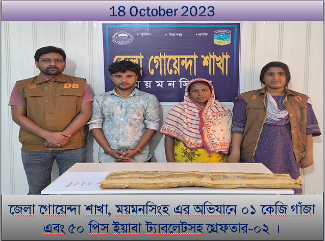 ময়মনসিংহ জেলা গোয়েন্দা সংম্থা ডিবি’র অভিযানে ১ কেজি গাজা ও ৫০ পিস ইয়াবাসহ ২ জনকে গ্রেফতার করেছ্