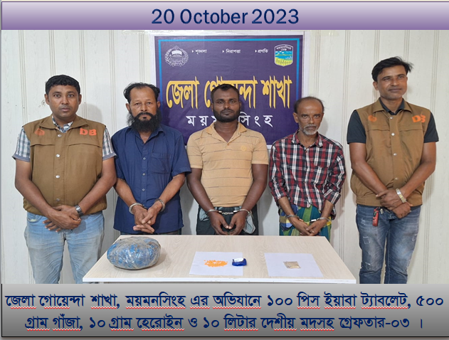 ময়মনসিংহ জেলা গোয়েন্দা সংস্থা ১০০ পিস ইয়াবা, ১০ গ্রাম হেরোইন ও ১০ লিটার মদসহ ৩ জনকে গ্রেফতার করেছে।