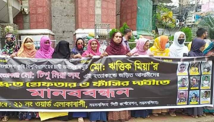 ময়মনসিংহে জুয়া খেলায় বাধা দেয়ায় বাকৃবির অস্থায়ী বাবুর্চি ঋতিক মিয়া (২০)-হত্যায় জড়িত হত্যাকারী টিপুসহ অন্যান্য আসামীদের দ্রুত গ্রেফতার ও ফাঁসির দাবিতে মানববন্ধন করেছে এলাকাবাসী। গতকাল রবিবার সকালে মহানগরীর গাঙ্গিনারপাড় মোড়ে ঘন্টাব্যাপী এ মানববন্ধন করে তারা। এসময় ঋতিক হত্যায় জড়িতদের গ্রেফতার ও ফাঁসি দাবি করে বক্তব্য দেন- নিহতের বাবা মোঃ মিলন, নিহতের মা মোছাঃ শিরিনা আক্তার, বড়ভাই শিশির, দাদী মোছাঃ রোকেয়া বেগম, নানা মোঃ খোকন, খালা জোছনা আক্তার, খালা সোমা আক্তার এবং এলাকাবাসীর পক্ষে বক্তব্য রাখেন- মোহাম্মদ আলী, আবু সাইদ, মোঃ মোফাজ্জল হোসেন, রফিকুল ইসলাম, তরিকুল ইসলাম, ময়মনসিংহ মহানগর স্বেচ্ছাসেবক লীগের সাবেক সদস্য শহিদুল ইসলাম সোহেল, জেলা যুবলীগের সদস্য বিপ্লব রহমান জুয়েল, ২০নং ওয়ার্ড আওয়ামী লীগের যুব ও ক্রীড়া বিষয়ক সম্পাদক ইশতিয়াক আহমেদ রুবেলসহ প্রমূখ। মানববন্ধনে বক্তারা ঋতিক হত্যায় জড়িত আসামীদের দ্রুত গ্রেফতারের দাবি জানায়। পাশাপাশি আইনশৃঙ্খলাবাহিনীর প্রতি আহ্বান জানিয়ে বলেন, টিপু, আরাফাত, শান্ত,জামান, অনিক,আল-আমীন,বিপুল,আসিফ, শরীফসহ অন্যান্য আসামিরা এখনো অধরা, তাদের দ্রুত গ্রেফতার করে আইনের আওতায় আনা হোক। প্রসঙ্গত, গত ১১ জুলাই শহরের চকছত্রপুর এলাকায় চিহ্নিত অপরাধীদের ছুরিকাঘাতে নিহত হয় ঋতিক। জুয়া খেলায় বাধা দেয়ায় নিহত যুবকের বাবা মিলন মিয়ার সঙ্গে ঝগড়া হয় একই এলাকার টিপু (২৩) নামে এক যুবকের। পরে বিষয়টি স্থানীয়ভাবে মিটমাট করা হয়। কিন্তু রাত আটটার দিকে জনৈক মধুর চায়ের দোকানের পিছনে ঋতিককে পিঠে ছুরিকাঘাত করে টিপু। পরে আহত রক্তাক্ত অবস্থায় ঋতিককে ময়মনসিংহ মেডিকেল কলেজ হাসপাতালের নেয়া হলে চিকিৎসাধীন অবস্থায় সে মারা যায়। ঋতিক বাংলাদেশ কৃষি বিশ্ববিদ্যায়লের একটি ছাত্রাবাসে অস্থায়ী পাচক হিসেবে কাজ করতেন। আর টিপু পেশায় রাজমিস্ত্রি।