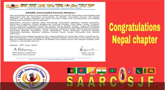 সার্ক সাংবাদিক ফোরাম এর কেন্দ্রীয় কার্যনির্বাহী কমিটি এস জে এফ নেপাল চ্যাপ্টারের ৩৫ সদস্যের কমিটি অনুমোদন করেছেন।