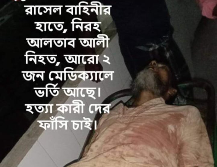 এলাকাবাসী জানান, চরকালিবাড়ি ( শম্ভুগঞ্জ টু পীরবাড়ি রোড) সন্ত্রাসী রাসেল বাহিনীর সাথে মাইন উদ্দিন মানুর কয়েকদিন আগে চা খাওয়া নিয়ে বিরোধের সৃষ্টি হয়। এর পরে মঙ্গলবার রাত প্রায় নয়টার দিকে আলতাব আলী পার্শ্ববর্তী মসজিদ থেকে এশার নামাজশেষে তার নিজবাড়ি ফিরছিলো। এদিকে সন্ত্রাসী রাসেল ও তার ভাড়াটিয়া বাহিনী নিয়ে, রাসেলের নেতৃত্বে হুমায়ুন, জহিরুল, রহিম, শহিদুল অস্ত্রসস্ত্র সহকারে দলবল নিয়ে মাইন উদ্দিন মানুর ভাতের হোটেলে হামলা করে। এসময় কয়েক রাউন্ড গুলির শব্দ তারা শুনতে পায়। সারা এলাকায় আতংকের সৃষ্টি হয়। মাইন উদ্দিন মানুর উপর হামলা না করা এবং হোটেলের ক্ষতি না করতে বয়োবৃদ্ধ আলতাব আলী বাধানিষেধ করে। এতে রাসেল বাহিনীর রাসেল সহ চক্রটি ক্ষিপ্ত হয়ে উঠে ধারালো অস্ত্র দিয়ে তাকে এলোপাতাড়ি কুপিয়ে ও ছুরিকাঘাত করে মারাত্মক আহত করে। একইসাথে সন্ত্রাসীরা মাইন উদ্দিন মানু, সজিব, রাজিয়া, বাবু ও মল্লিককে কুপিয়ে ও ছুরিকাঘাত করে মারাত্মক আহত করে। সন্ত্রাসীদের একাংশ ময়মনসিংহ শহরের দিকে আসে অপর অংশ ময়লা ফেলার দিকে চলে যায়। পরে আহতদেরকে স্থানীয়রা উদ্ধার করে ময়মনসিংহ মেডিকেল কলেজ হাসপাতালে ভর্তি করে। রাতেই চিকিৎসাধীন অবস্থায় আলতাব আলী মারা যান। আলতাব আলীর মৃত্যুর খবর এলাকায় ছড়িয়ে পড়লে স্থানীয়দের মাঝে ক্ষোভ সৃষ্টি হয়। এতে পরিস্থিতি অস্বাভাবিক হতে শুরু করলে কোতোয়ালি মডেল থানার পুলিশ পরিদর্শক তদন্ত আনোয়ার হোসেনের নেতৃত্বে পুলিশ পরিস্থিতি নিয়ন্ত্রণে আনেন। এ ঘটনায় নিহতের ছেলে আশিক বাদি হয়ে কোতোয়ালি মডেল থানায় মামলা দায়ের করেছেন। যার নং ৬৩, তারিখ ২২/০৫/২৪।