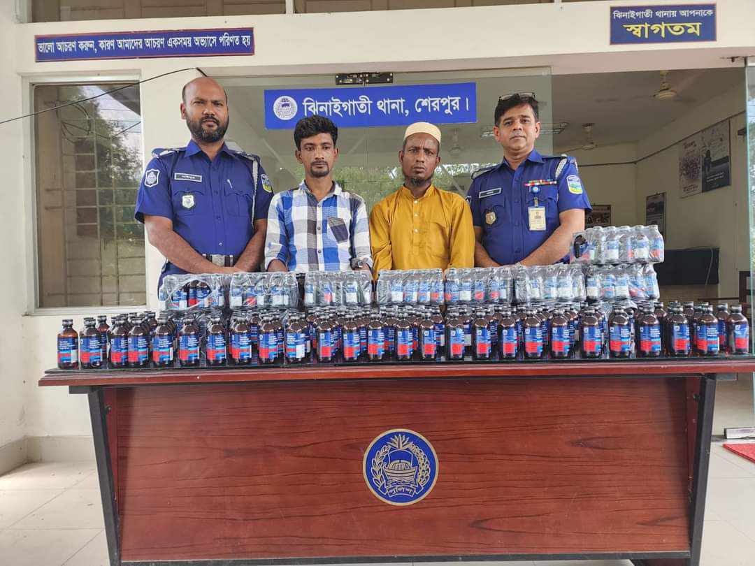 শেরপুরের ঝিনাইগাতীতে ৫০০ বোতল ফেন্সিডিলসহ মোর্শেদ খন্দকার ফকির ও আমীর হোসেন নামে দুইজনকে গ্রেফতার করেছে ঝিনাইগাতী থানা পুলিশ। গ্রেফতারকৃতরা হচ্ছে শ্রীবরদী উপজেলার গেরা মারা কাকিলাকুড়া গ্রামের আব্দুল্লাহ খন্দকারের পুত্র মোর্শেদ খন্দকার ফকির (৩৫) ও ঝিনাইগাতী উপজেলার রামেরকুড়া (স্টেডিয়াম এর পার্শ্বের) গ্রামের জয়নাল আবেদীন মিস্ত্রীর পুত্র মোঃ আমীর হোসেন (৩০)।৬ জুন ২০২৪ সকাল সাড়ে ১০ টায় তাদের গ্রেফতার করা হয়। গ্রেফতারকৃতদের কাছে থেকে ৫০০ বোতল ফেন্সিডিল উদ্ধার ও একটি অটো রিক্সা জব্দ করা হয়।উদ্ধারকৃত ফেন্সিডিলের বর্তমান বাজার মূল্য আনুমানিক ৭ লক্ষ ৫০ হাজার টাকা। পুুলিশ সূত্রে জানা গেছে,গোপন সংবাদের ভিত্তিতি ঝিনাইগাতী থানার অফিসার ইনচার্জ (ওসি) মো.বছির আহমেদ বাদলের নির্দেশে এসআই তনু নন্দন কুমার রুরামের নেতৃত্বে একদল পুলিশ সদস্যরা ঝিনাইগাতী উপজেলার সীমান্তবর্তী গজনী ও বাকাকুড়া বাজারের মধ্যবর্তী এলাকায় অভিযান চালিয়ে ৫০০ বোতল ফেন্সিডিলসহ তাদেরকে গ্রেফতার করা হয়।গ্রেফতারের সময় আরও ২/৩ আসামী পালিয়ে যায়। ধৃত আসামীদের জিজ্ঞাসাবাদে জানায় যে,পলাতক আসামীদের মধ্যে ১ জন তাদের পরিচিত। তাহার নাম- রেজুয়ান (২৮) পিতা- লোকমান হোসেন,শ্রীবরদী উপজেলার সাতানী গ্রামের ৭ নং ওয়ার্ডে তার বাড়ি। অন্যান্য অজ্ঞাত পলাতক আসামীদের নাম ঠিকানা এখনো পাওয়া যায়নি। অন্যান্য আসামিদেরকে গ্রেফতার করতে অভিযান অব্যাহত রয়েছে।ঝিনাইগাতী থানার অফিসার ইনচার্জ (ওসি) বছির আহমেদ বাদল এ বিষয়ে সত্যতা নিশ্চিত করে জানান, বৃহস্পতিবার দুপুরে গ্রেফতারকৃত ওই দুই আসামির বিরুদ্ধে মাদক আইনে মামলা দায়েরের পর শেরপুর আদালতে প্রেরণ করা হয়েছে।