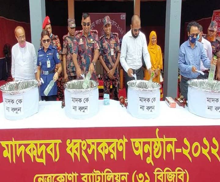 নেত্রকোণা ব্যাটালিয়ন (৩১ বিজিবি) কর্তৃক গত ০১ ডিসেম্বর ২০১৭ হতে ১১ মে ২০২২ তারিখ পর্যন্ত ১,৩৭,২৫,৩০০/- টাকা মূল্যমানের বিভিন্ন প্রকার মাদকদ্রব্য মালিকবিহীন/পরিত্যক্ত অবস্থায় আটক করেন। যা আজ আনুষ্ঠানিকতার মাধ্যমে ধ্বংস করা হয়। ধ্বংসকৃত মাদকদ্রব্যের পরিসংখ্যান নিম্নরুপ ঃভারতীয় বিভিন্ন প্রকার মদ, ৮৯৭৪ বোতল,মূল্য-১ কোটি,৩৪ লাখ,৬১ হাজার টাকা। ভারতীয় বিয়ার ৬৬বোতল মূল্য-১৬ হাজার ৫শ টাকা।ভারতীয় ফেন্সিডিল ২৫৭ বোতল, মূল্য -১ লাখ, ০২ হাজার,৮শ টাকা। ভারতীয় ইয়াবা ট্যাবলেট ৪০৩ পিস মূল্য-১লাখ, ২০ হাজার,৯শ টাকা। ভারতীয় গাঁজা ৪.৬ কেজি মূল্য ১৬ হাজার,১শ টাকা। ভারতীয় সেনেগ্রা/ভায়াগ্রা ট্যাবলেট ৮০ পিস মূল্য-৮হাজার টাকা।