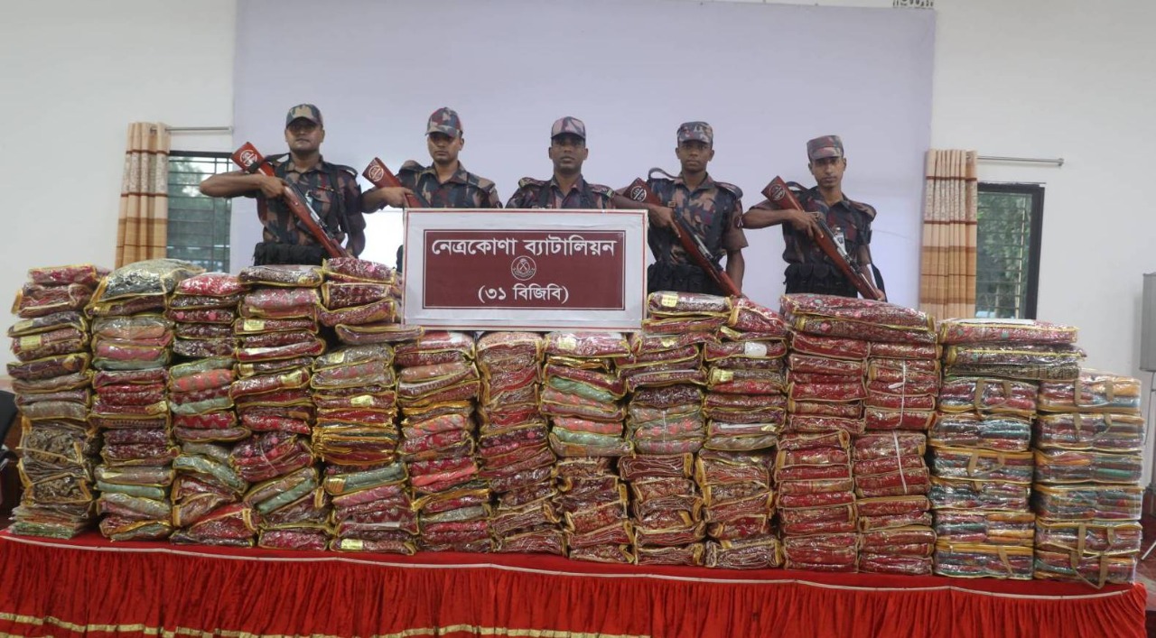 আজ ০৪ আগস্ট ২০২২ তারিখ আনুমানিক ১২৩০ ঘটিকায় নেত্রকোণা ব্যাটালিয়ন (৩১ বিজিবি) এর অধীনস্থ নেত্রকোনা জেলার দূর্গাপুর উপজেলার ২ নং দূর্গাপুর ইউনিয়নে অবস্থিত বারমারী বিওপি হতে নিজস্ব গোয়েন্দা তথ্যের ভিত্তিতে অত্র ব্যাটালিয়নের অধিনায়ক লেঃ কর্ণেল এ এস এম জাকারিয়া, পিএসসি এর নেতৃত্বে ২৪ সদস্যের একটি টহল দল কর্তৃক চোরাচালান বিরোধী অভিযান পরিচালনাকালে সীমান্ত মেইন পিলার ১১৬৩ হতে আনুমানিক ১৫০ গজ বাংলাদেশের অভ্যন্তরে উত্তর বারমারী নামক এলাকা হতে পরিত্যক্ত মালিকবিহীন অবস্থায় ভারতীয় কেজিএফ-টু শাড়ি-২১৬ টি, মিক্স মাসালা শাড়ি-৫৩ টি এবং লেহেঙ্গা-২৮৫ টি জব্দ করা হয়। যার সর্বমোট সিজার মূল্য ২৯,২৬,০০০/-(ঊনত্রিশ লক্ষ ছাব্বিশ হাজার) টাকা। জব্দকৃত চোরাচালানী মালামাল নেত্রকোনা কাষ্টমস্ অফিসে জমা করা হবে।