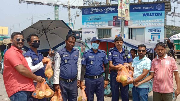 প্রচন্ড গরমে ট্রাফিক পুলিশের পাশে দাঁড়ালেন  যুবলীগের সিনিয়র রাহাত খান
