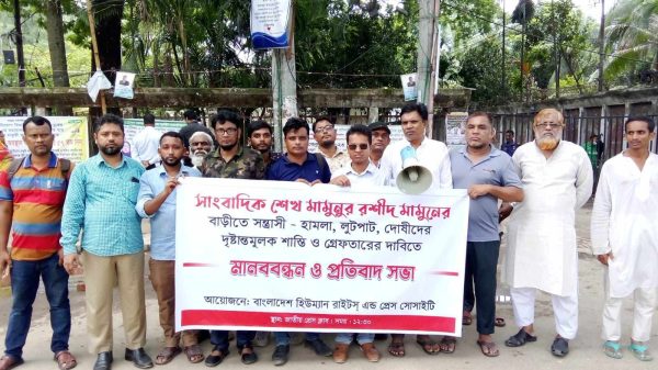 দুর্গাপুরে সাংবাদিক মামুনের বাড়িতে হামলাকারীদের গ্রেফতার দাবীতে মানববন্ধন