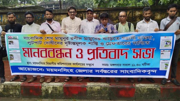নেত্রকোণায় সাংবাদিকের পরিবার ও বাড়িঘরে হামলার প্রতিবাদে ময়মনসিংহে মানববন্ধন