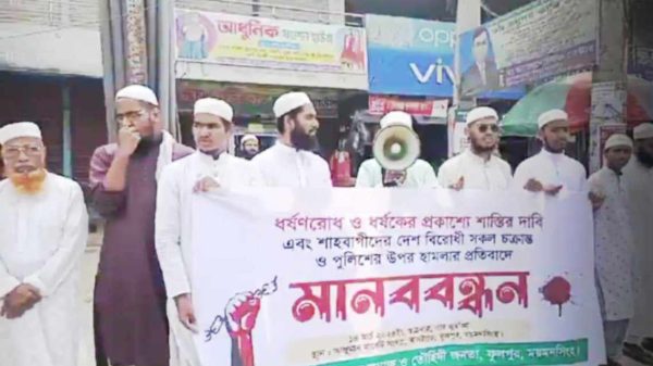 ফুলপুরে ধর্ষণরোধ ও ধর্ষকের প্রকাশ্য শাস্তির দাবি সহ পুলিশের উপর হামলার প্রতিবাদে মানববন্ধন